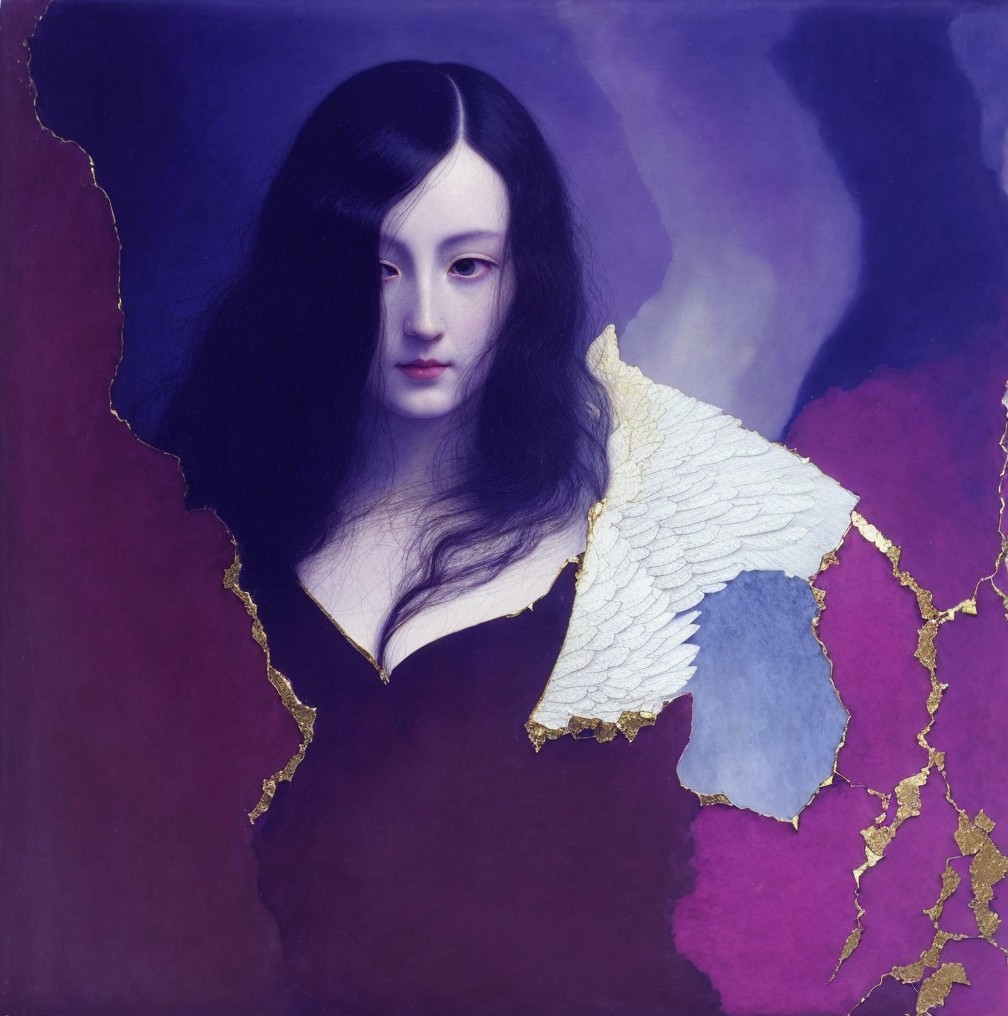 Portrait of a woman with angel wings, dark hair, in a red dress, against a blue background with gold-leaf cracks.