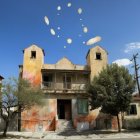 A whimsical, cartoonish building features unique architectural shapes, with large, expressive eyes on the facade. Four quirky characters with teardrop shapes surround the structure, enhancing its playful vibe.