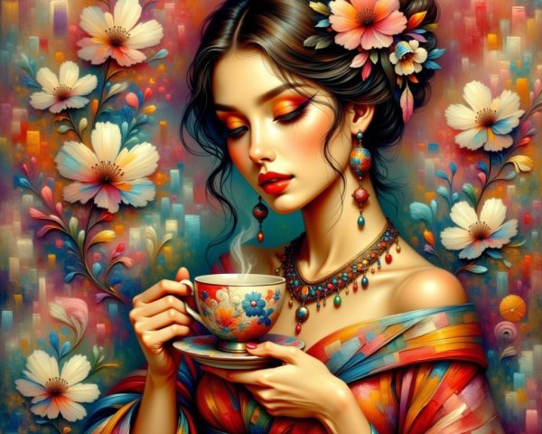A young woman with vibrant, pastel-colored hair adorned with flowers. She has a soft expression, bright eyes, and wears a colorful, flowery outfit against a dreamy, rainbow backdrop.