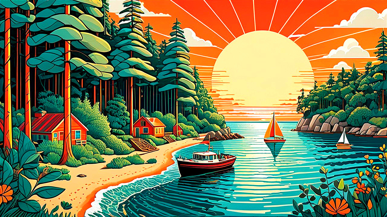 A vibrant sunset illuminates a tranquil lakeside scene, featuring colorful cottages, lush trees, and sailing boats gliding across the water, creating a serene and picturesque atmosphere.