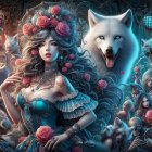 A beautifully adorned woman with flowing, shiny hair and floral accessories stands beside a wolf-like dog. Their vivid surroundings include colorful orbs and oversized mushrooms, creating a magical atmosphere.