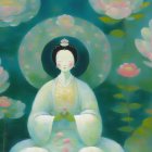 A serene figure with a pale complexion sits gracefully amidst blooming lotus flowers, embodying tranquility and wisdom, surrounded by ethereal celestial elements in soft, harmonious colors.
