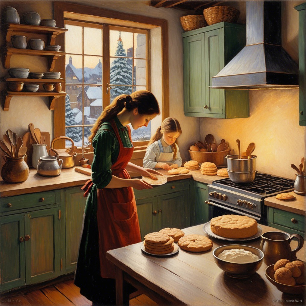 A warm, cozy kitchen scene shows a woman and a girl baking cookies. Sunlight filters through a window, illuminating trays of cookies and rustic cabinets, creating a nostalgic, heartwarming atmosphere.
