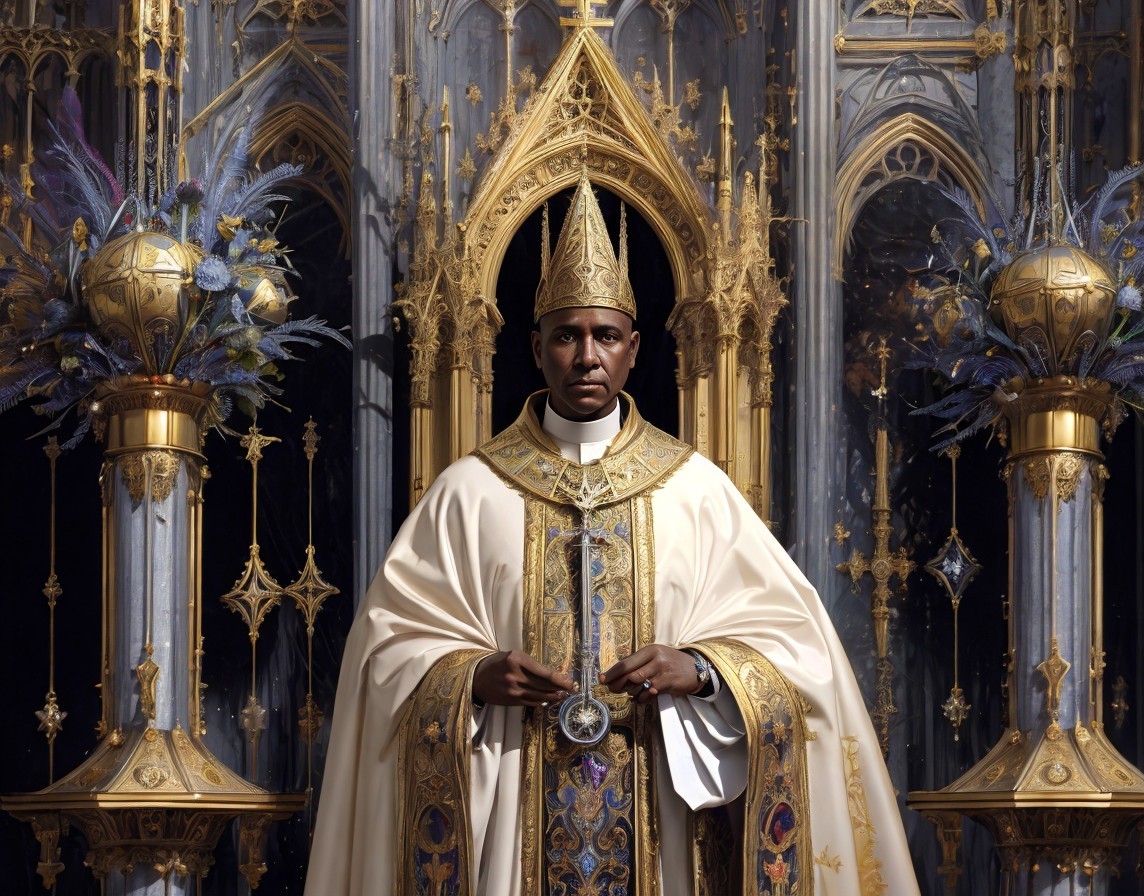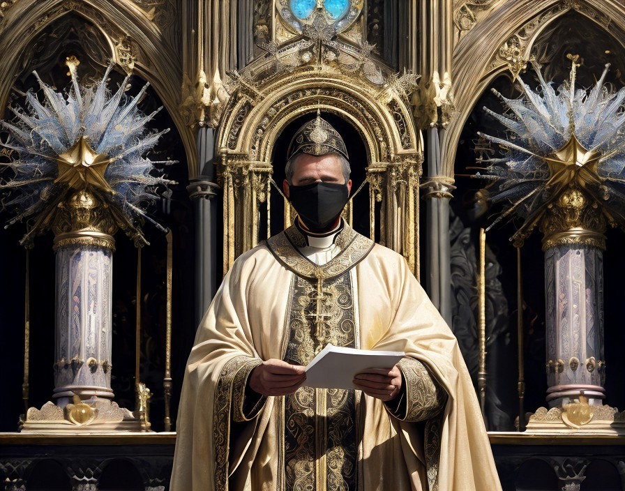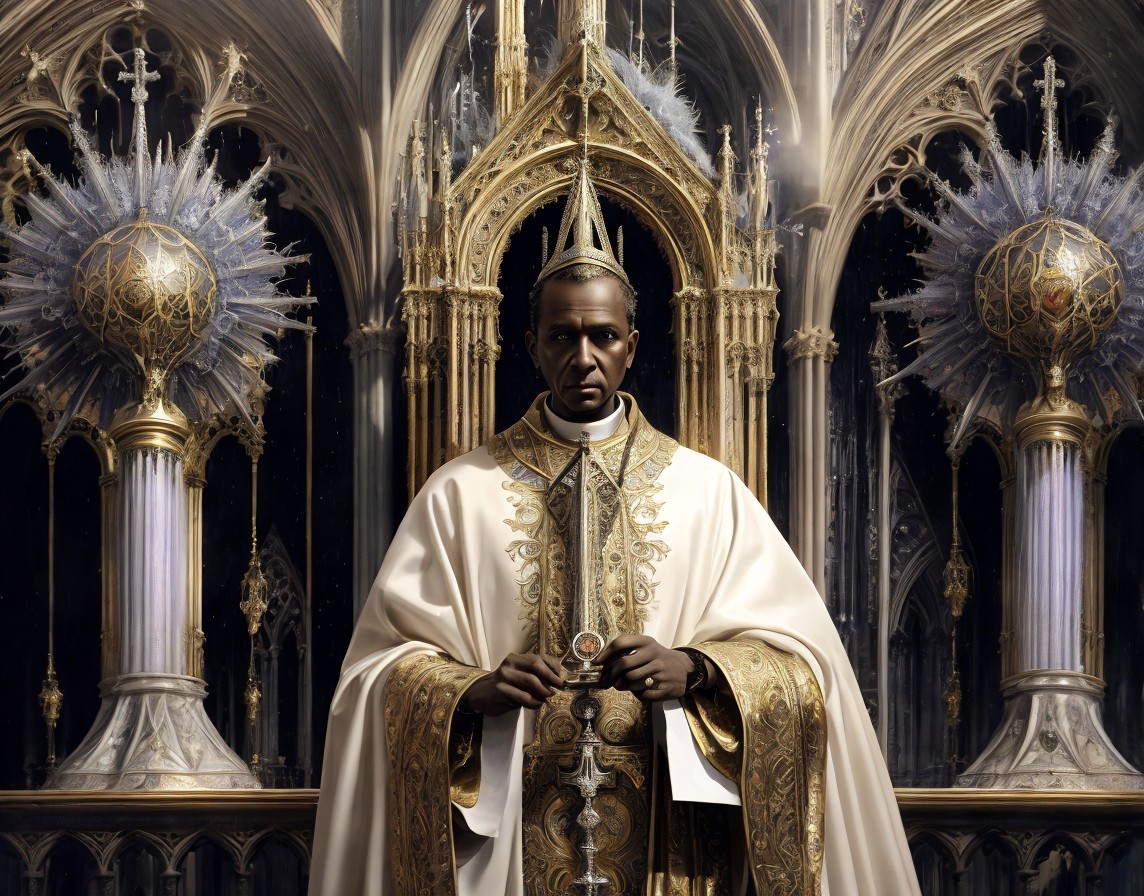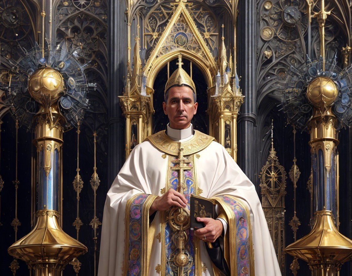 Prompt: "create an image with an Intricate detailed painting of Roman Catholic bishop standing in the cathedral's hall surrounded by aliens with huge black eyes, ink drawing By Jamie Heiden, Paul Klee, Karol Bak, extremely detailed, high definition, crisp quality, ultra detailed background, vivid color, peculiar as f*ck! Occult as f*ck! Creepy as f*ck"