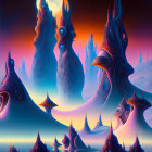 A surreal landscape features towering, crystal-like mountains with fluid shapes, set against a vibrant sky. Ethereal colors of blue, purple, and orange blend, creating a dreamlike atmosphere.