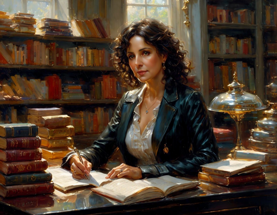 + Prompt:in style Daniel Gerhartz: A middle-aged woman with a straight Greek nose, gray eyes, and dark curly hair, clearly worked out details, high resolution, gentle radiance, high definition, high detail elaboration, high resolution, Hyper detailed, light reflections