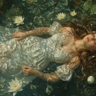 A young woman in a flowing white dress floats serenely on a calm water surface, surrounded by lush green lily pads and white water lilies, exuding a dreamy, ethereal atmosphere.