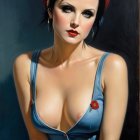 A striking portrait of a woman with short, dark hair featuring red highlights. She wears a sleek, form-fitting outfit and gazes confidently at the viewer against a dark background.
