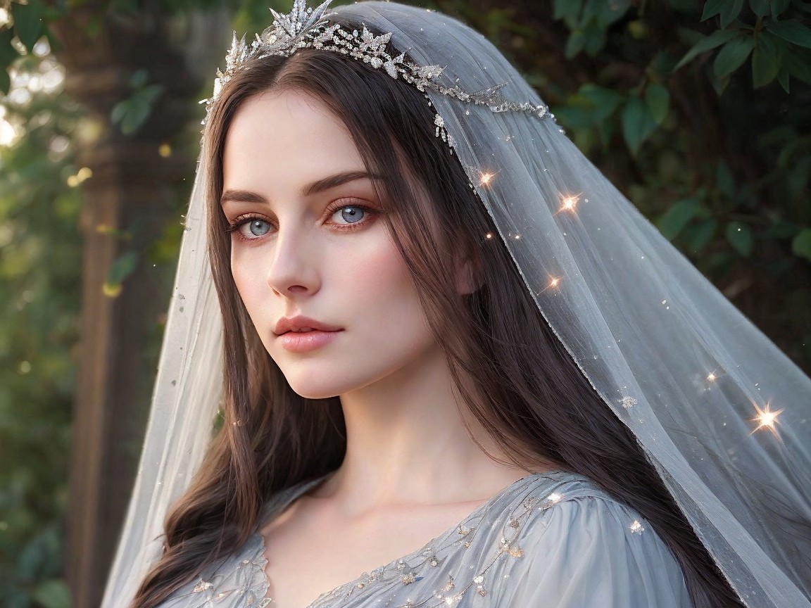Prompt: "Arwen Undómiel, daughter of Elrond — the Evenstar of her people — depicted in a pre-raphaelite aesthetic. Her beauty is serene and timeless: luminous pale skin, deep grey-blue eyes filled with ancient sorrow and courage. Long dark hair flows like twilight silk, subtly reflecting starlight.