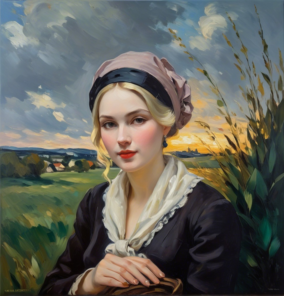 A young woman with a gentle expression gazes intently, wearing a dark dress and white headscarf. The background features a vibrant sunset over a serene landscape.