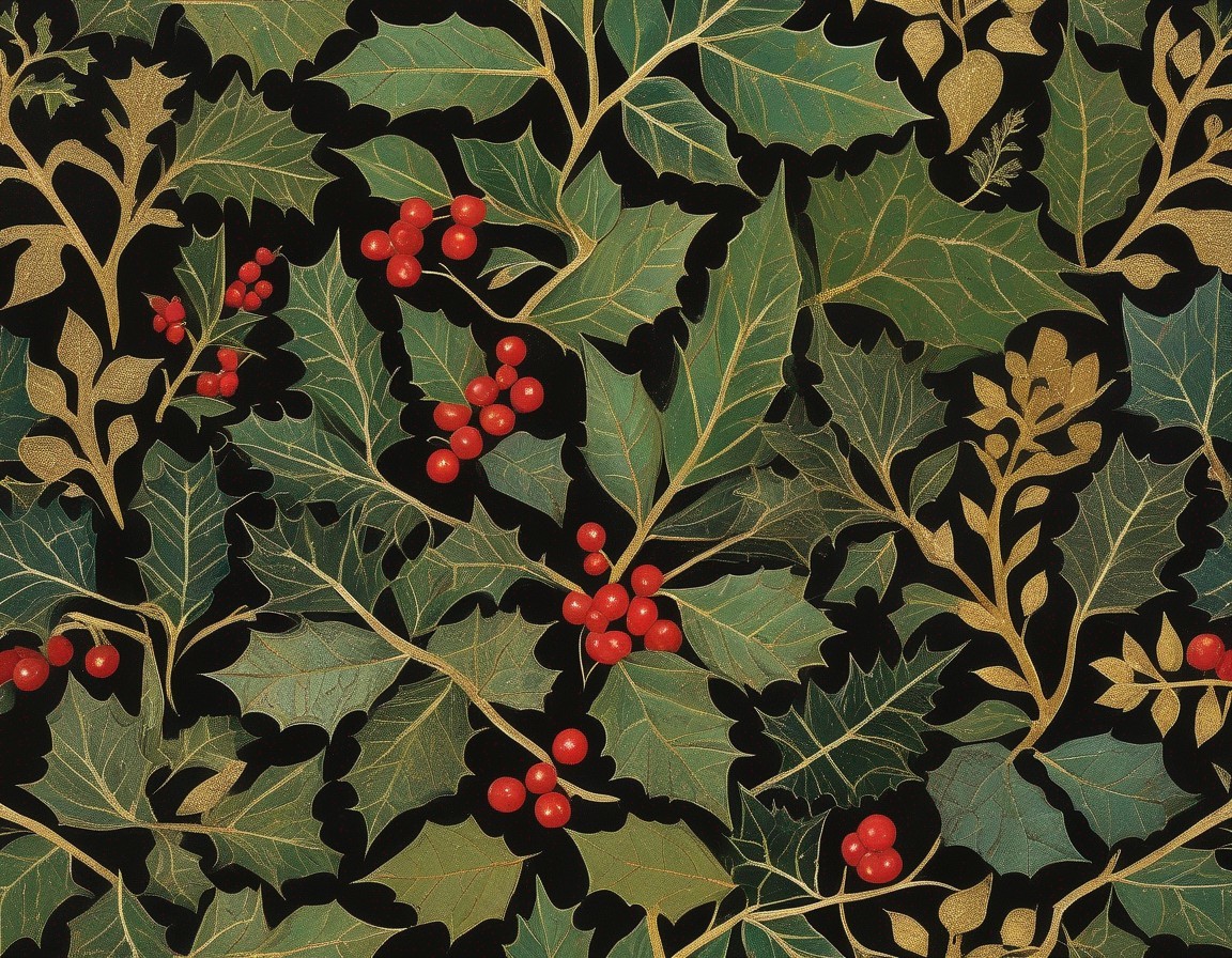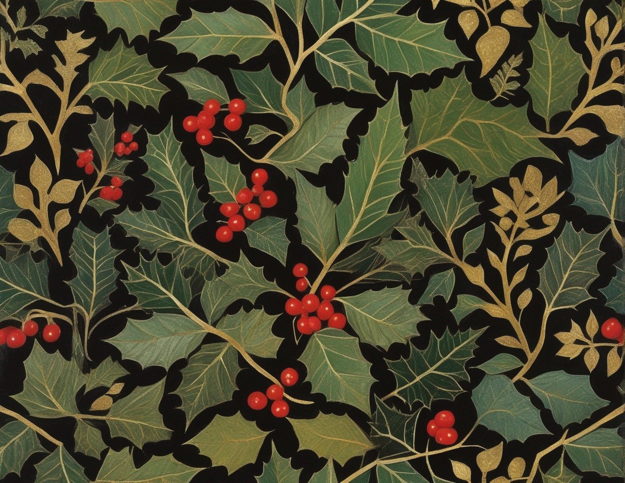 Green Holly Leaves and Red Berries Pattern on Dark Background with Gold Accents