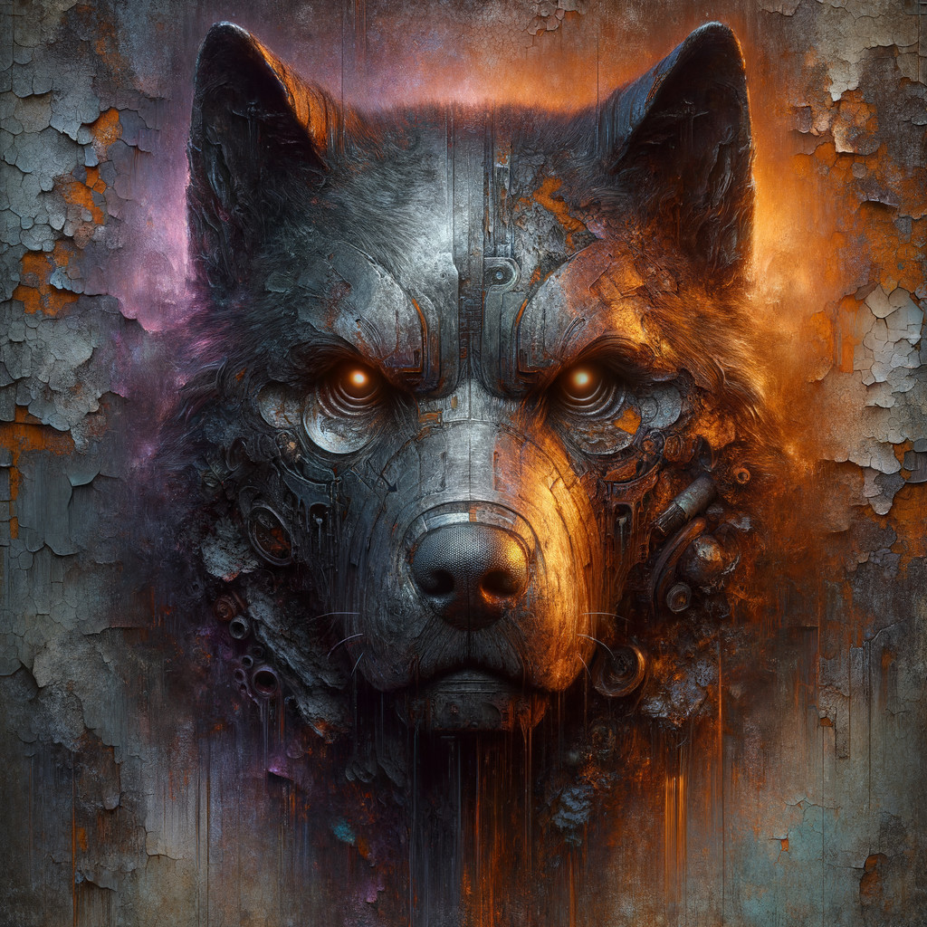 Prompt: "Vertical layout, close-up perspective, hyper-realistic digital art, featuring a detailed and weathered dog with glowing dark eyes.The head is rusted and has a worn texture, showing signs of age and use. His expression is somber. The background is a cracked and peeling wall, adding to the post-apocalyptic feel. Dominant colors are orange, gray, dark purple, and black. The image is high quality with no visual aberrations, and the entire image is filled with intricate and realistic elements. Create by using high dynamic range, cinematic lighting, post-apocalyptic theme, high contrast, dramatic composition, ethereal glow, detailed textures, realistic rendering, strong highlights, deep shadows, digital painting techniques, chiaroscuro, HDR photography, intricate details"
