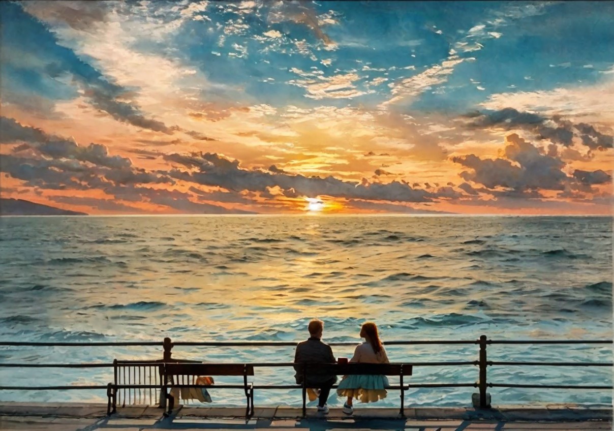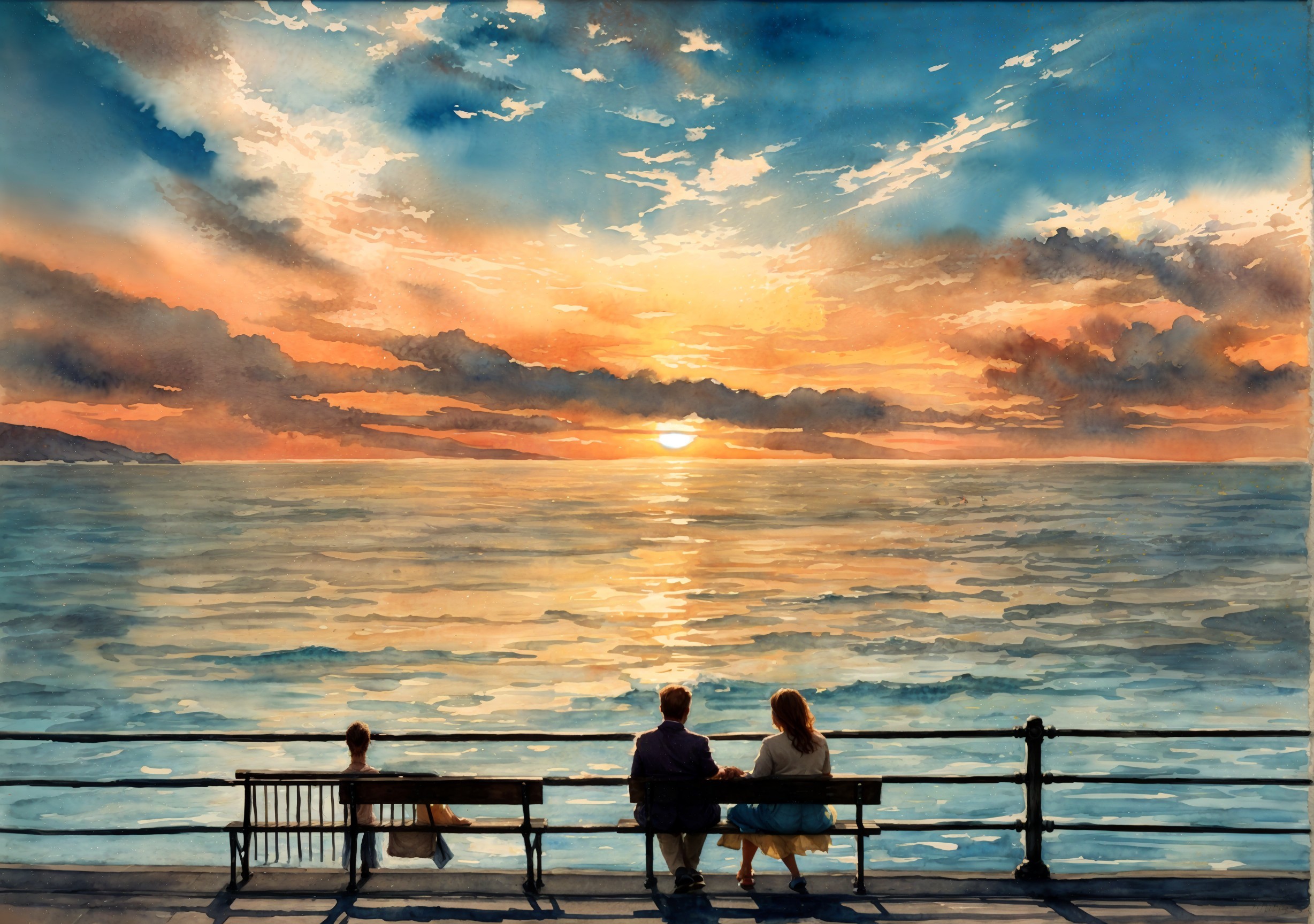 A serene sunset over a tranquil sea, with vibrant hues of orange and blue. Three figures sit on a bench, enjoying the view, evoking a sense of peace and connection with nature.