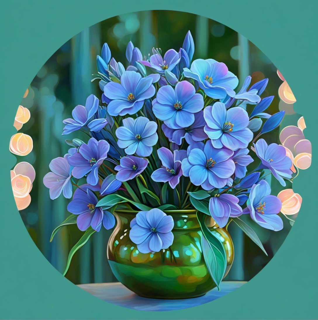 A vibrant bouquet of blue flowers in a glossy green vase. The intricate petals and delicate details shimmer, complemented by a soft, blurred background that evokes a serene ambiance.