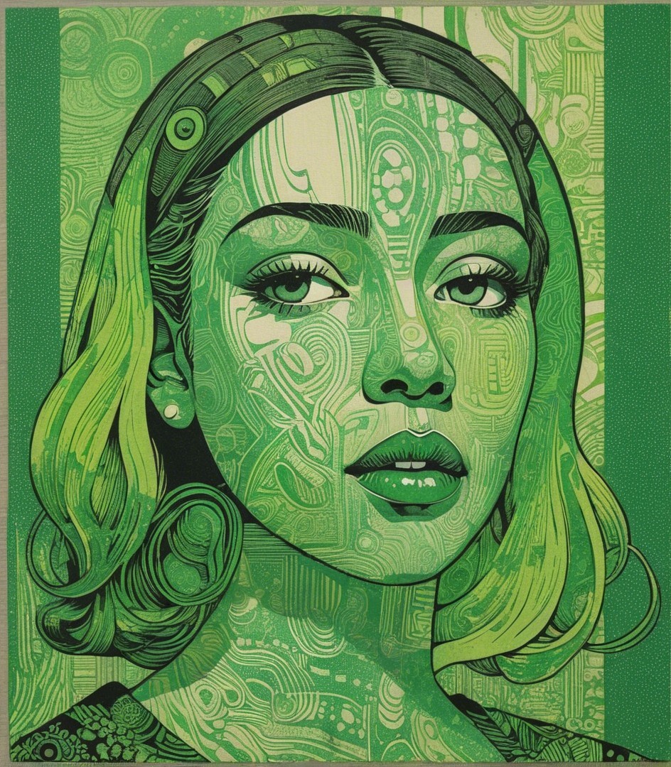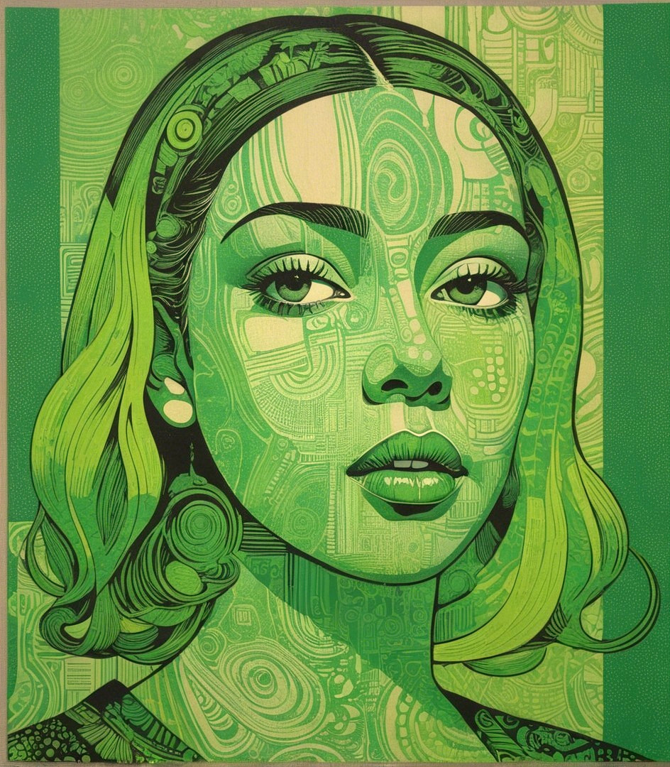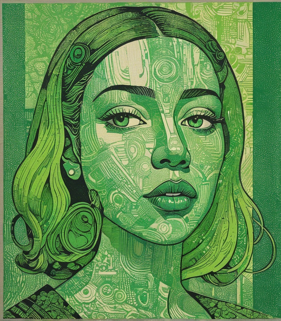 Prompt: stylized portrait, styles by Eduardo Paolozzi and Tai-Shan Shierenberg and Renny Tait, linocut, warped, green gradient inking colors, collagraphy, high plasticity. Gothic-inspired woodblock print featuring a stylized portrait with a juvenile essence. whimsical watercolor and ink painting emerges, featuring tiny outlines that intricately define an eerie twist, grunge aesthetic, teal and sea-green accents, wavery dappled lighting, foampunk, dyed, smooth brightness, joyful, 3 point lighting, consistent lines for a coherent and nuanced composition, immerse in an intricate world, crafted ambiance,, emotional depth, intricate details, unique fragmented painterly style with heavy brushstrokes by Brandon Mably, hand-drawn illustration style, irregular strokes, blotting, plasticity 1.4, naive shockwaves in colour foiling. extravagant peeling layers .Pastel colors transition into a misty void adds a touch of magic to the composition, enriching it with psychosomatic undertones and a fantastical flair. Parallax occlusion 1.3, subsurface scattering, high coloring, lineage details by Ho Baron., meticulous detail with fine pen strokes, intricate patterns,triadic color scheme of light-ochre, auburn and metallic honey, plasticity 1.3, precise gelsculpt 64k, 3d effects, uhd, hdr, vfx-inspired, hues by Man Ray, overall composition by Didier Lourenço, dynamic lighting, squiggly line-art features, tall and stacked lines, dof, bokeh, debeh, negative lucas numbers, patchwork theme, banging, scruffy, restraint, raw, exuding joyful pencil sketch art blend, painterly style, rich and saturated colors, bold and detailed brushwork, elegance, space-age & pulp sci-fi inspiration, psychedelic, futuristic, glowing,