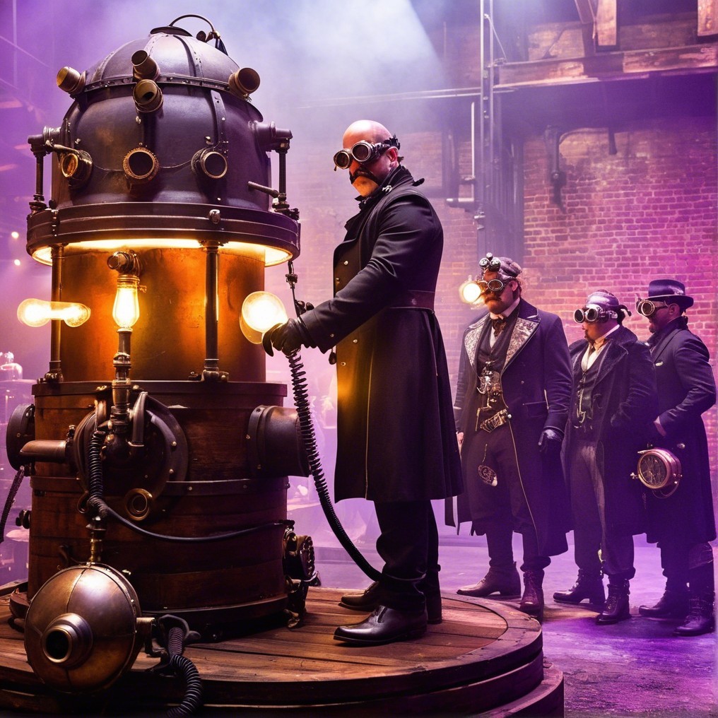 A dimly lit, industrial-style venue with exposed brick walls and aged metal beams, adorned with vintage pipes and distressed wooden accents, sets the stage for a mesmerizing steampunk-themed event. In the foreground, three elaborately costumed individuals stand out, donning intricate goggles, ornate masks, and billowy black robes, complete with pocket watches, lanterns, and an assortment of peculiar vials and contraptions. A fourth person, clad in casual attire with long, flowing hair, walks across the scene, adding a touch of contrast to the otherwise opulent atmosphere. Beyond them, a raised stage bears a bold, cursive 'Steampunk' sign, backed by a sea of attendees in elaborate costumes, their faces aglow with excitement. Tables laden with an array of peculiar treasures and trinkets, illuminated by warm, golden lighting, Complete the scene, evoking a sense of vibrant, imaginative wonder.
