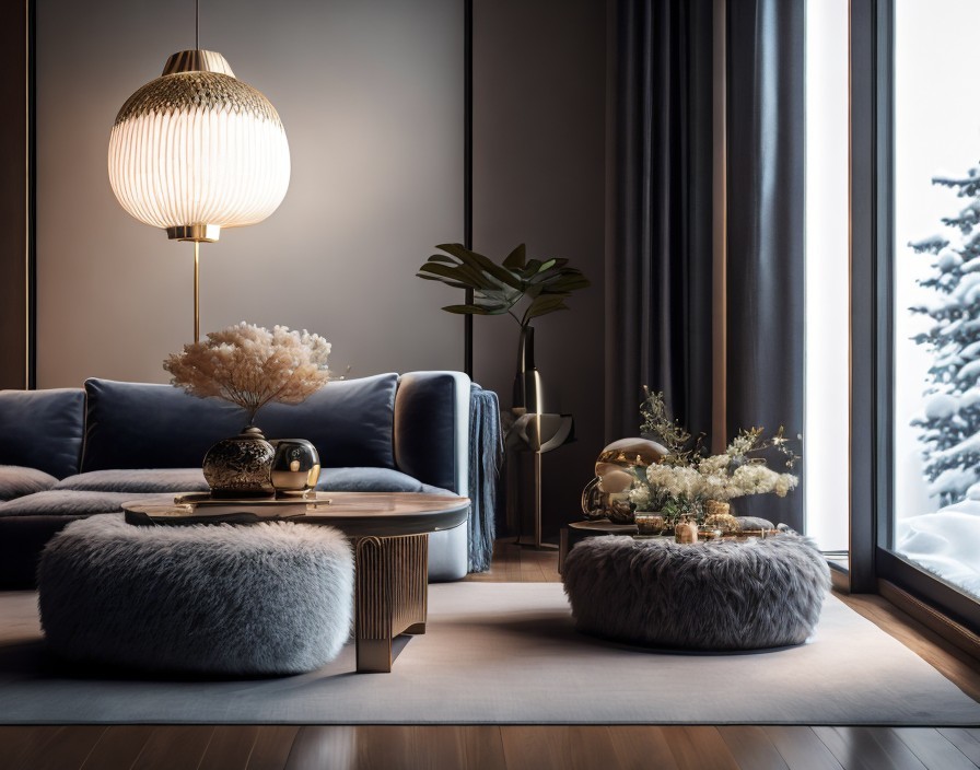 The photo of the luxurious living room from the front, Cinematic - detail - shot, table in zen-inspired, japanese minilaist living room , cinematic - contour - lighting, highly detailed, winter, rainy eveing, Canon EOS R
