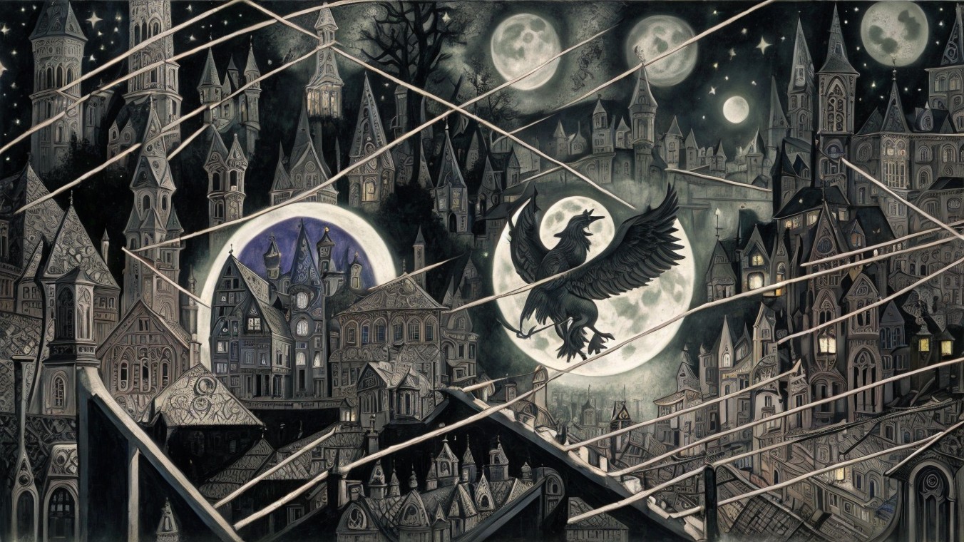 Four women on a rooftop at night looking up at a full moon and a glowing yellow pentagram in the sky above a medieval town with tall buildings, spires, and glowing windows, dark blue night sky with clouds, stone walls on the left, an antique lantern on the rooftop, and pots and