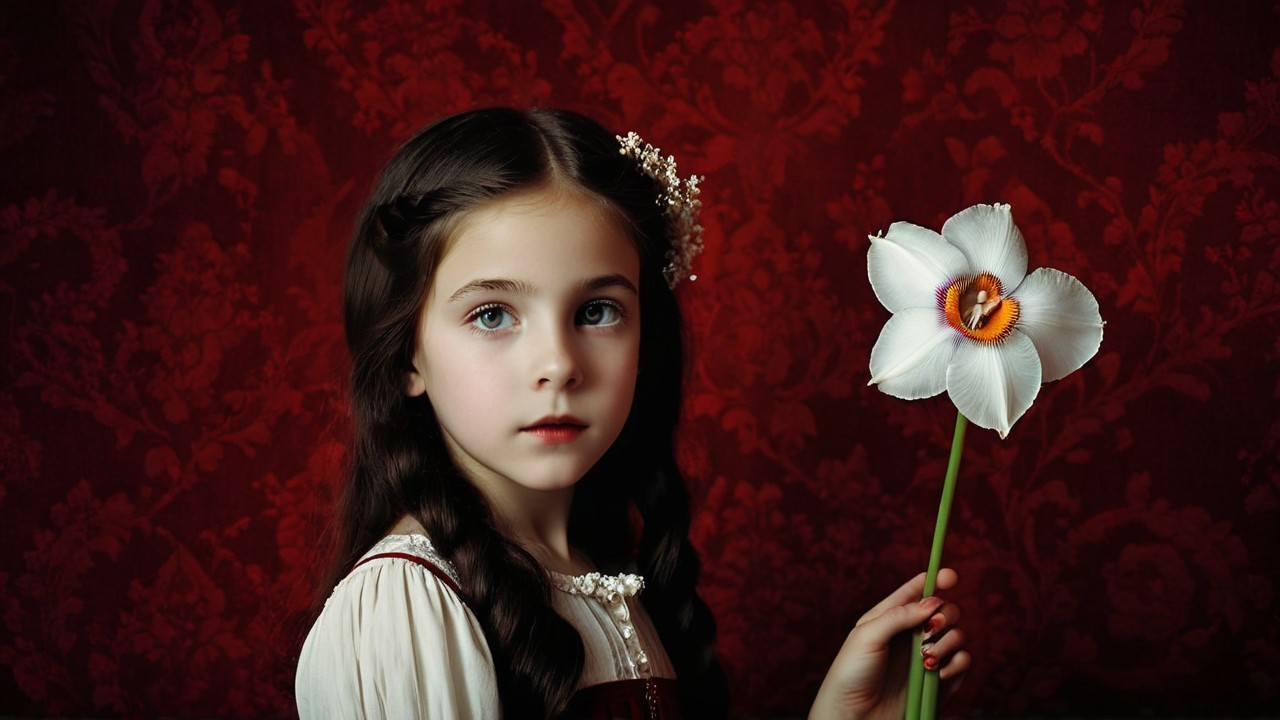 A young girl with long, dark hair holds a large white flower against a deep red background. She gazes thoughtfully, wearing a simple, vintage-style dress and a delicate flower accessory in her hair.