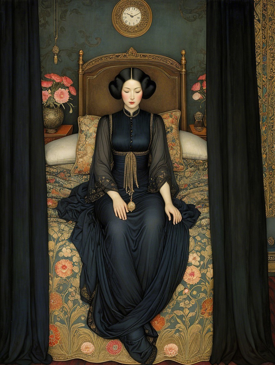 A mesmerizing figure in a flowing, dark gown adorned with jewels, stands gracefully behind curtains, framed by intricate golden patterns and a luminous moon, exuding elegance and mystery.