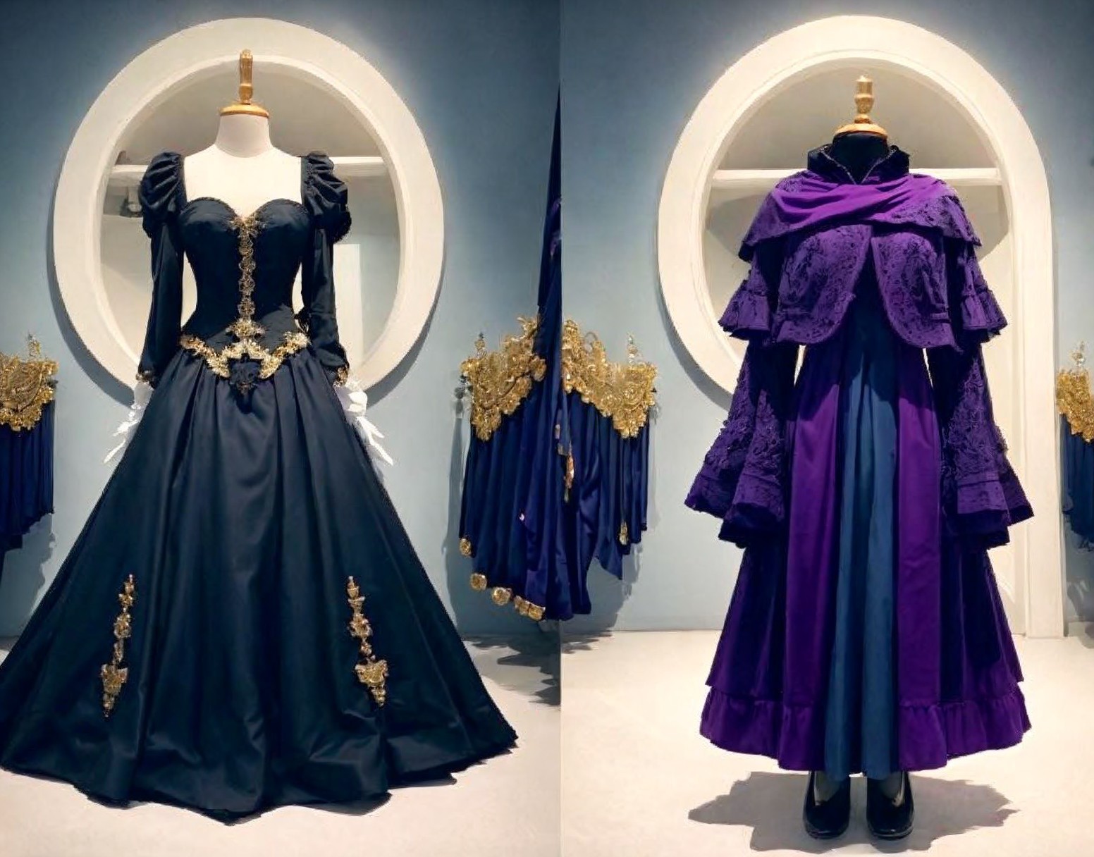 The image showcases two elegant garments: a black gown adorned with intricate gold detailing and a dramatic purple cloak, both featuring lavish designs, set against a stylish backdrop.