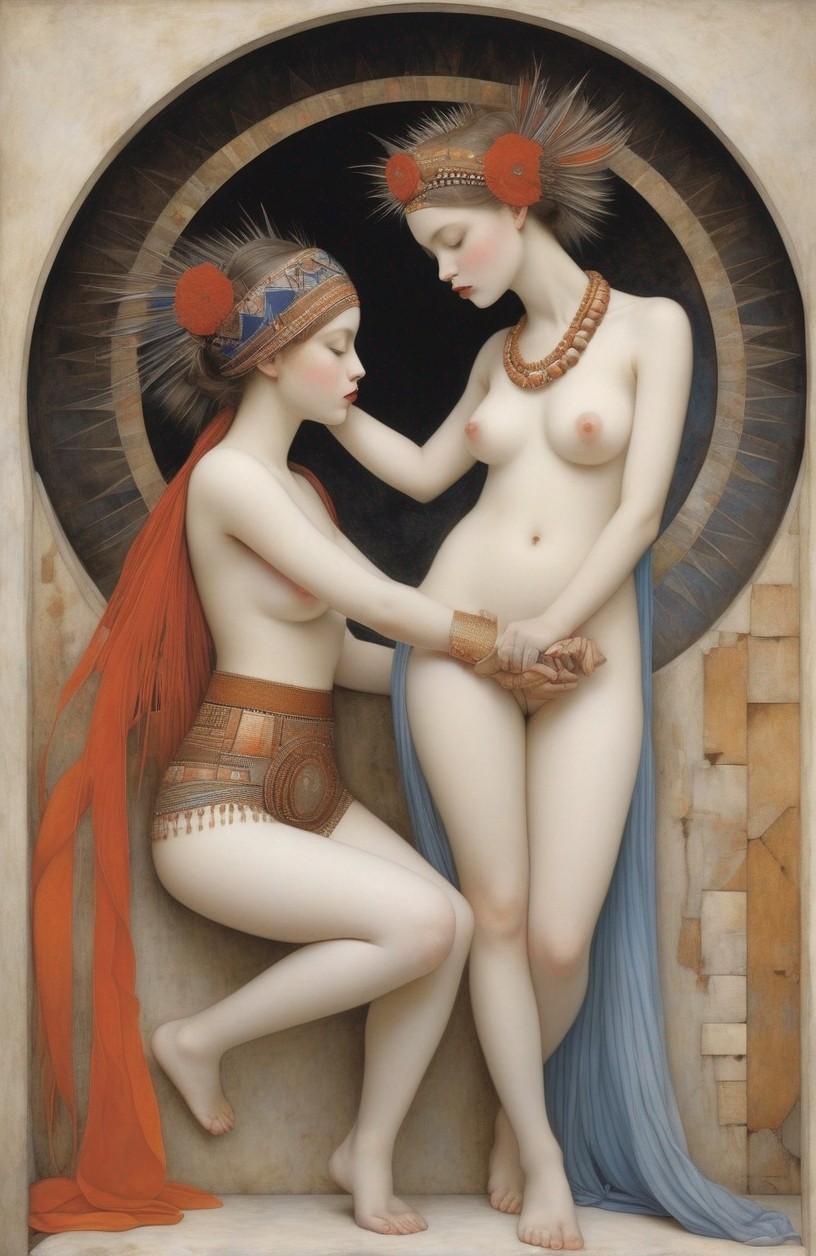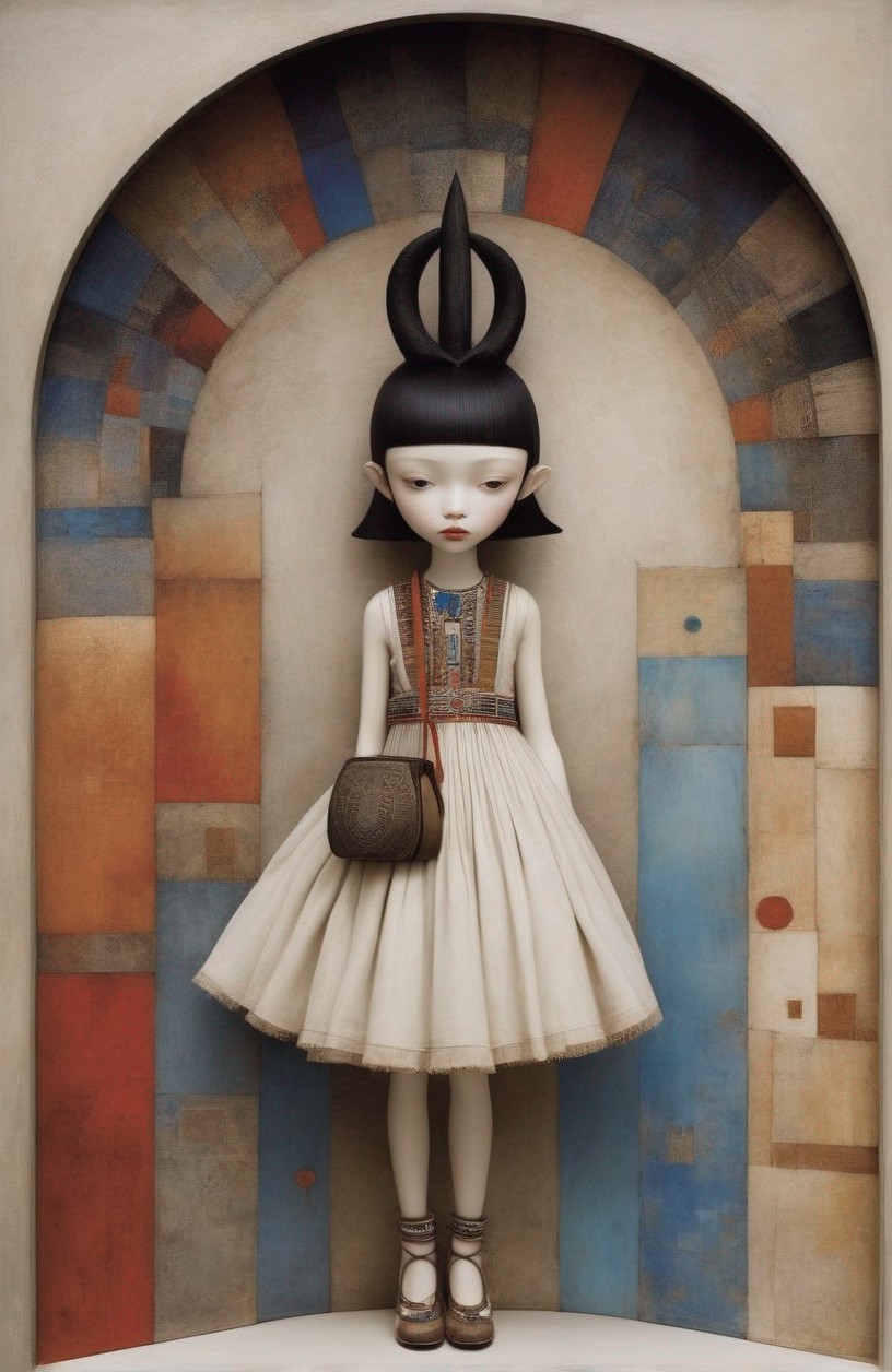 Solemn doll-like figure surrounded by smaller figures and a white rabbit
