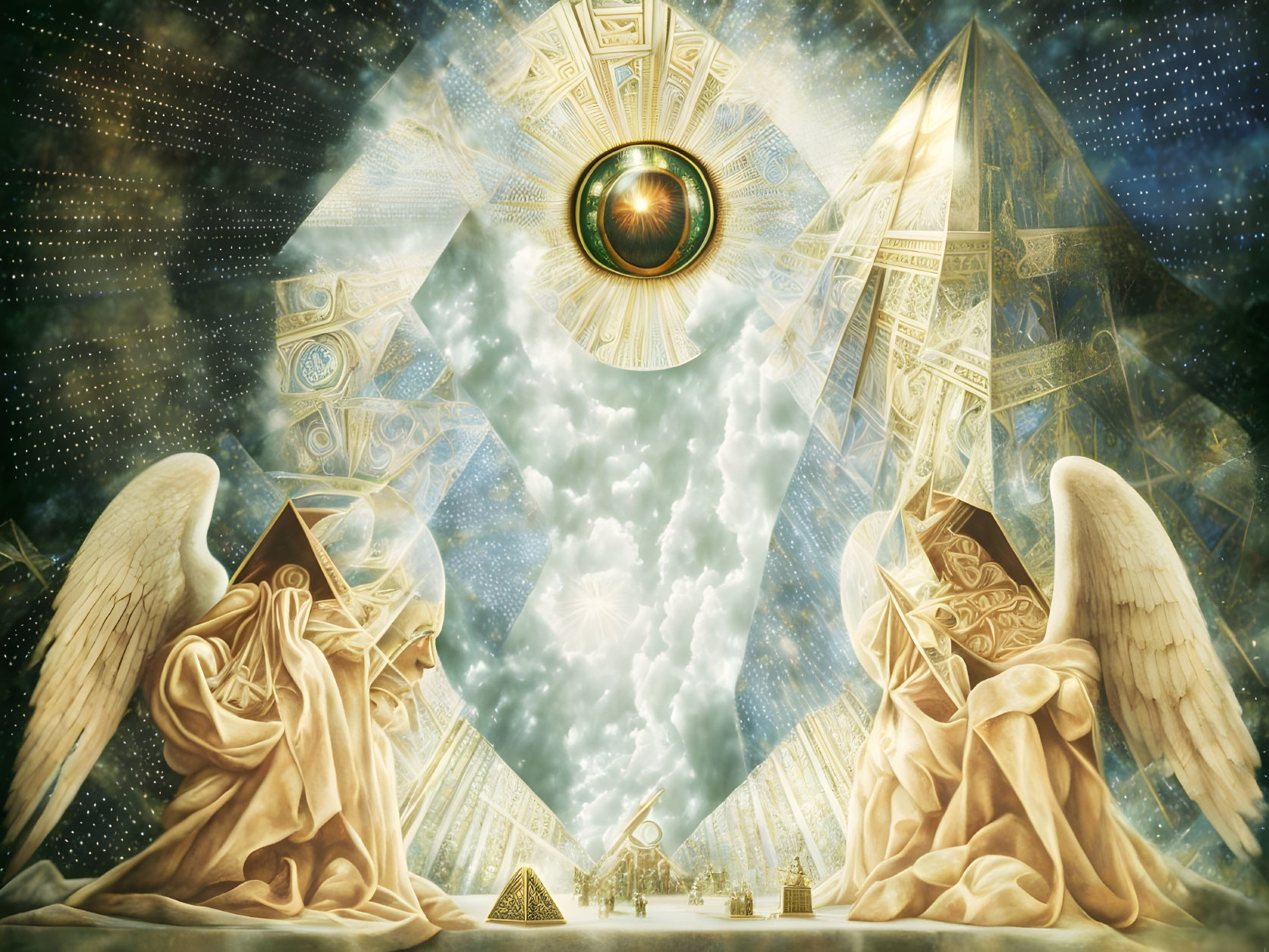 The Eye in the Pyramid, All-Seeing Eye, Masonic symbolism. Clouds. Angels. great walls. The light of god.