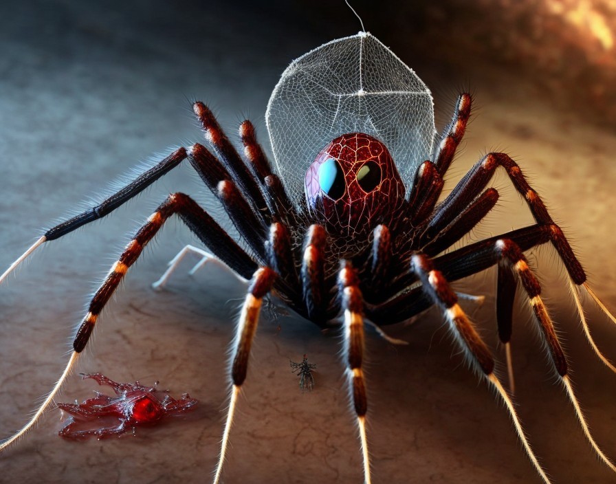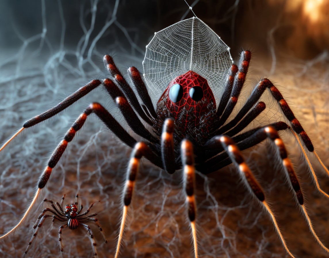 Stylized, menacing spider with glowing red patterns in eerie environment.