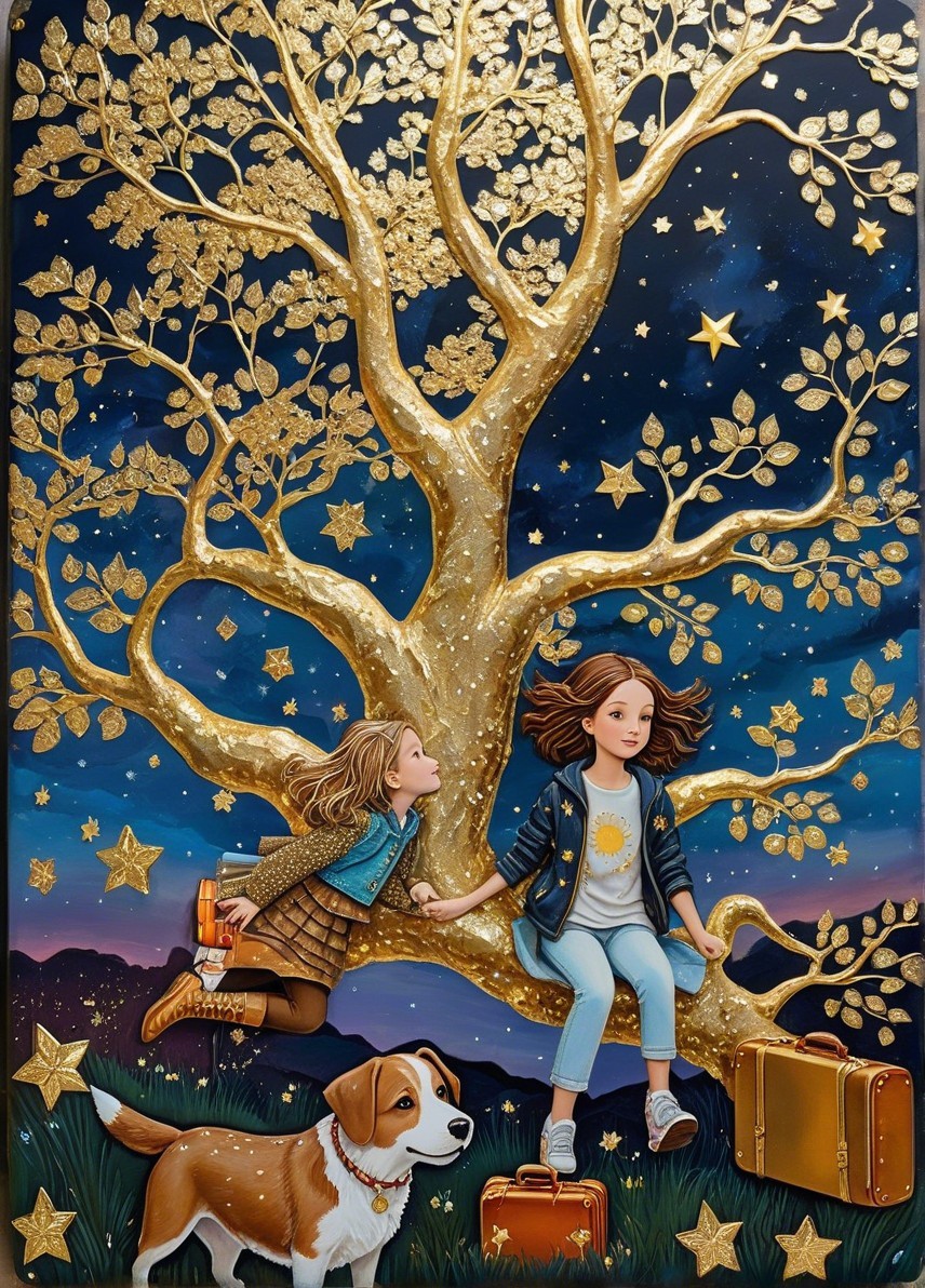 Two girls stroll beneath a shimmering golden tree at dusk, accompanied by a playful dog. They carry vintage bags, embodying a sense of adventure and wonder in a magical, starry landscape.