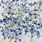 The artwork features abstract shapes and patterns in blue and gold hues, interspersed with human-like faces. Geometric forms blend seamlessly, creating a dynamic visual rhythm.