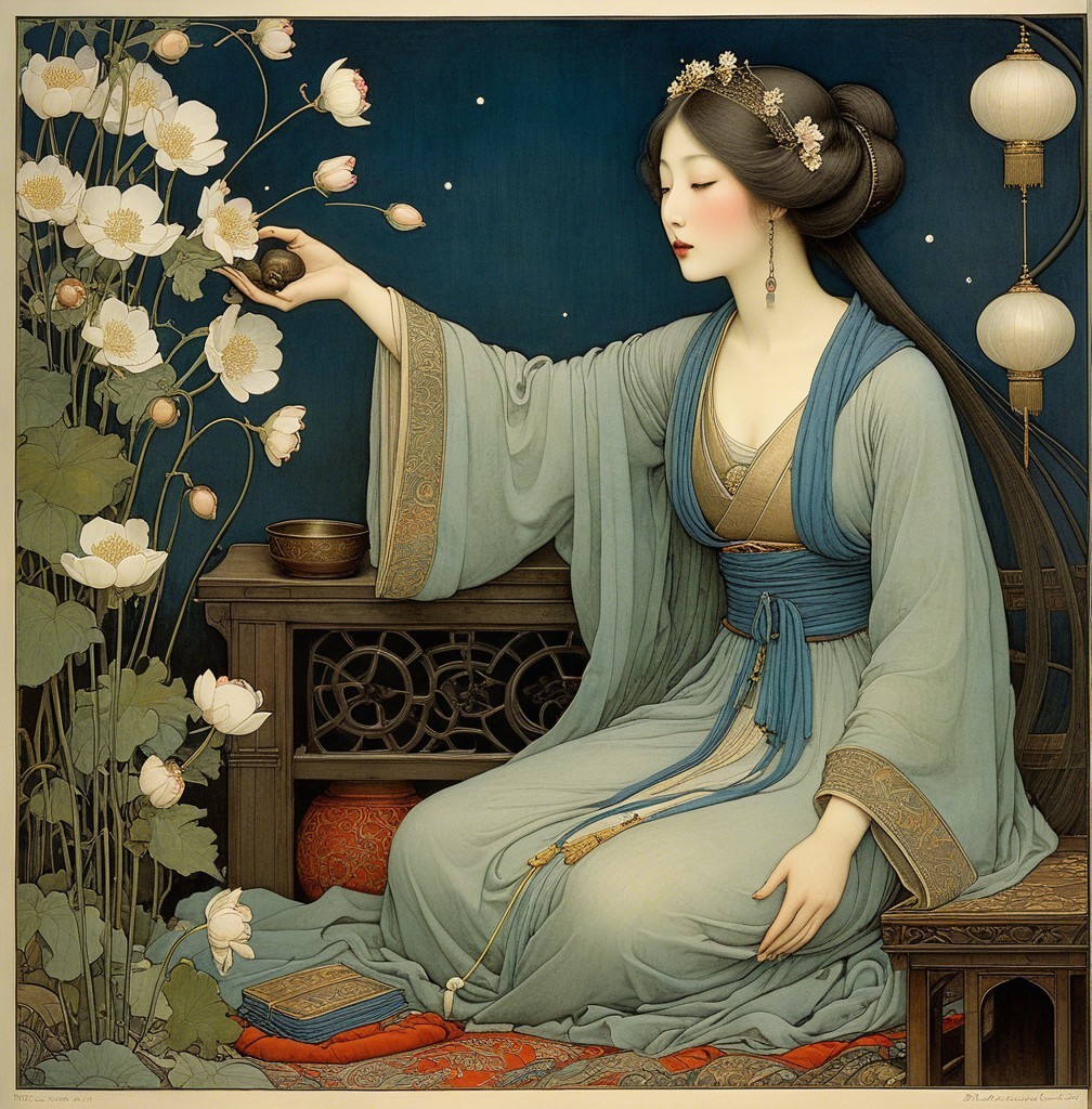 A serene woman in a flowing gown sits in a field at twilight, gracefully reaching out to golden flowers. The scene is adorned with moons shining in a deep blue sky, exuding tranquility and beauty.