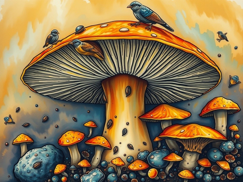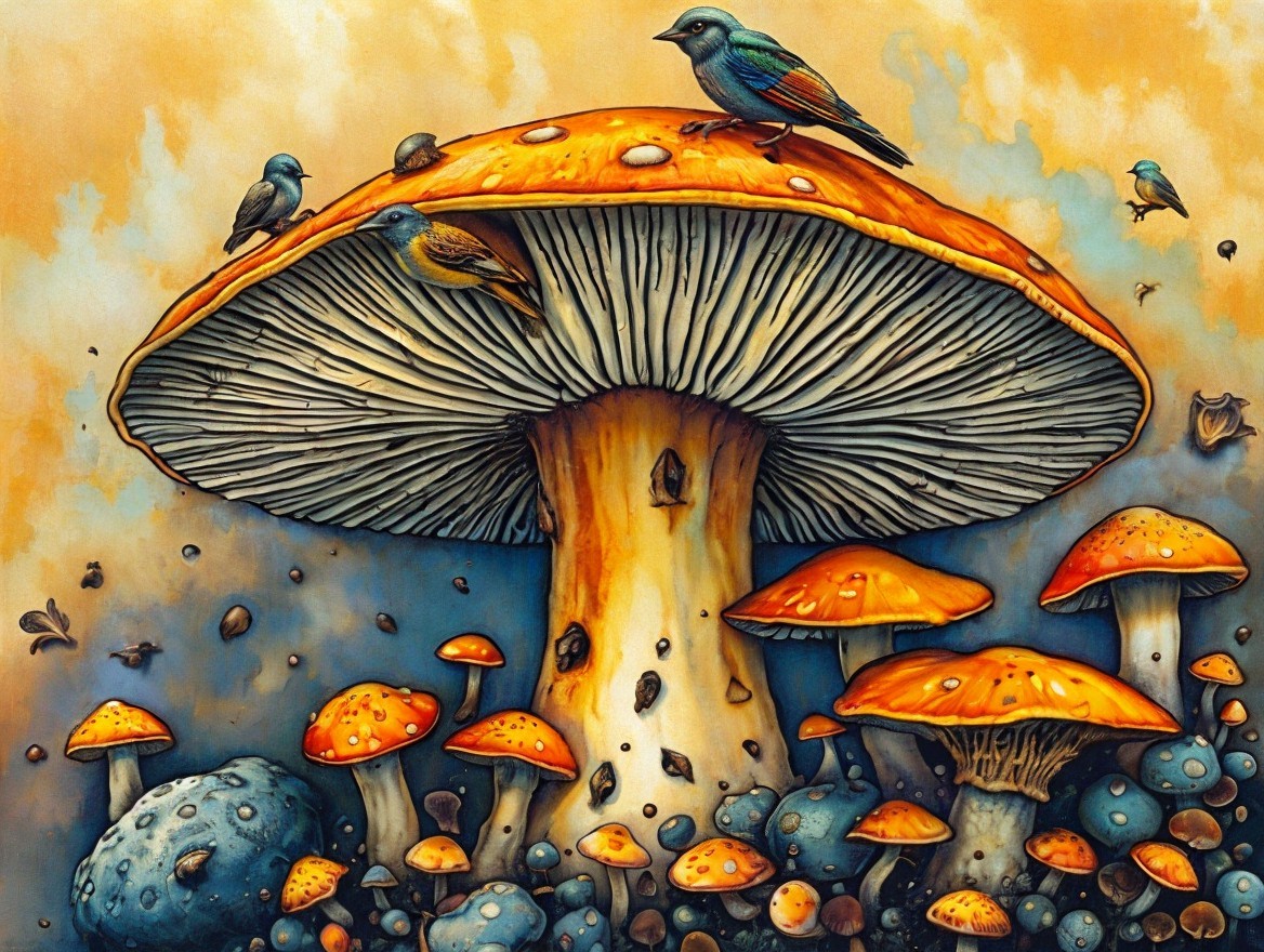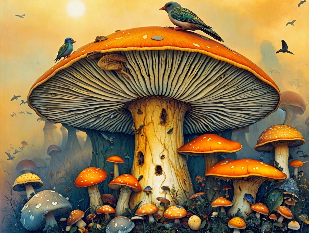 A whimsical scene featuring a towering orange mushroom surrounded by smaller mushrooms, with colorful birds perched atop and a fantastical landscape in the background, illuminated by a warm glow.