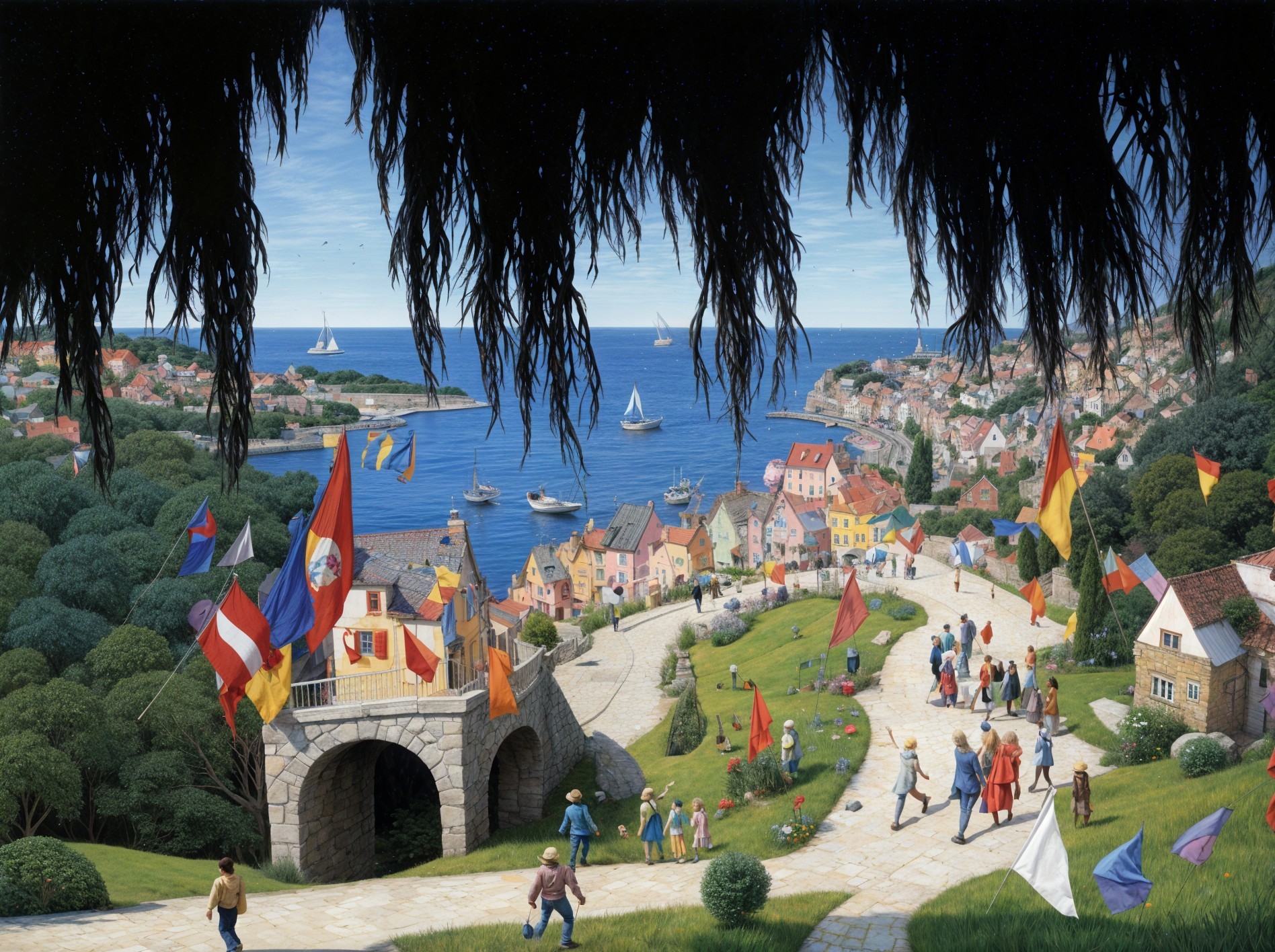 A vibrant coastal scene features colorful houses along a winding road, people strolling, and balloons in the air. Sailboats dot the serene bay, framed by lush hills and a quaint castle.