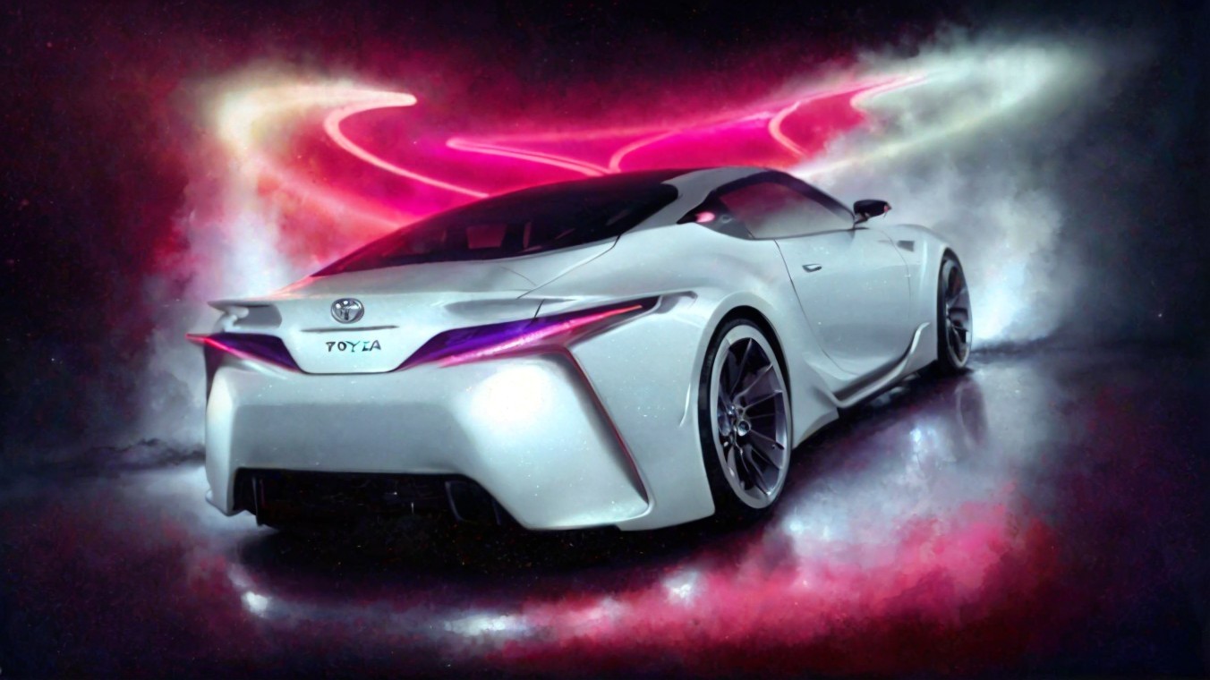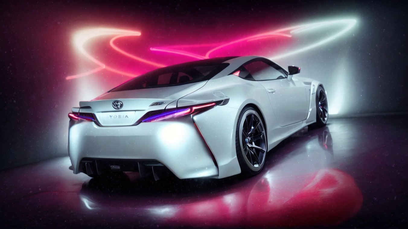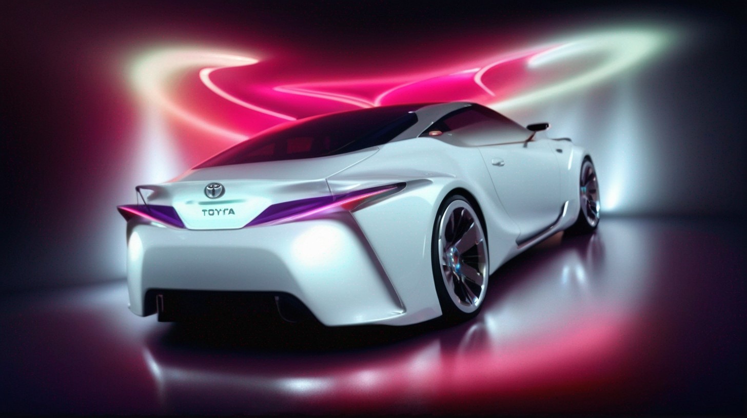 The image showcases a sleek, white Toyota car with a modern design, highlighted by vibrant pink and purple light trails in the background, creating a dynamic and futuristic atmosphere.