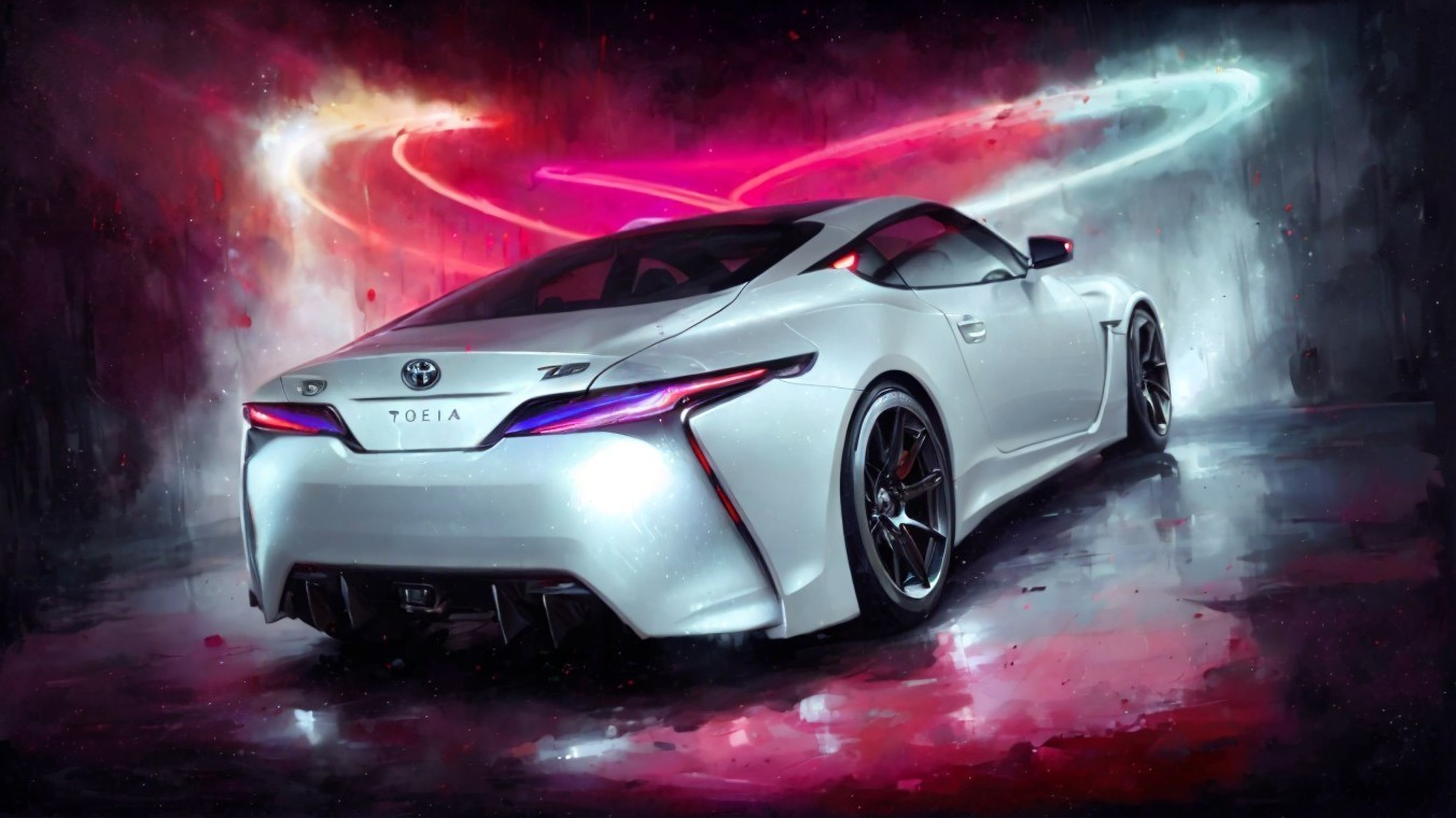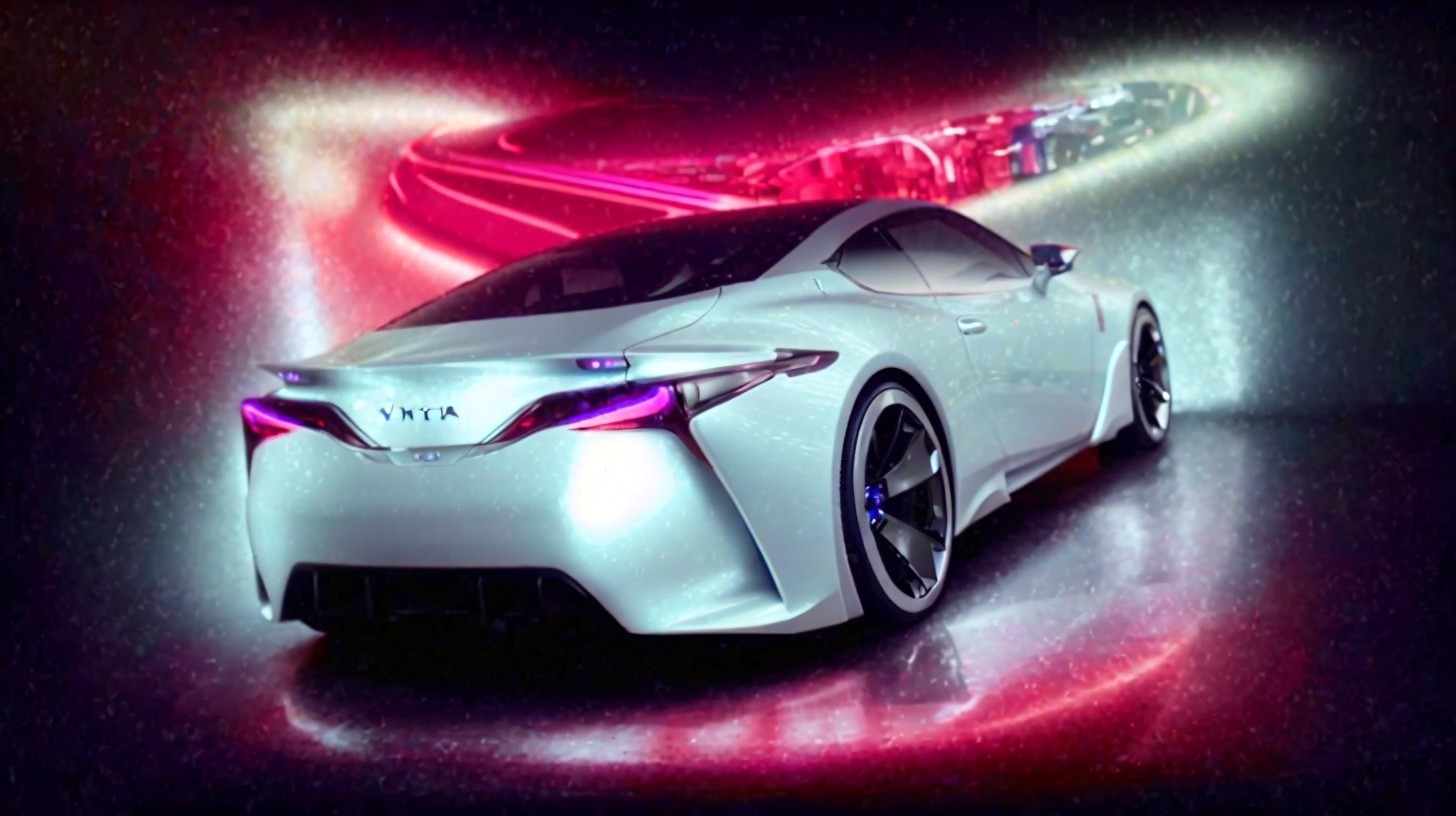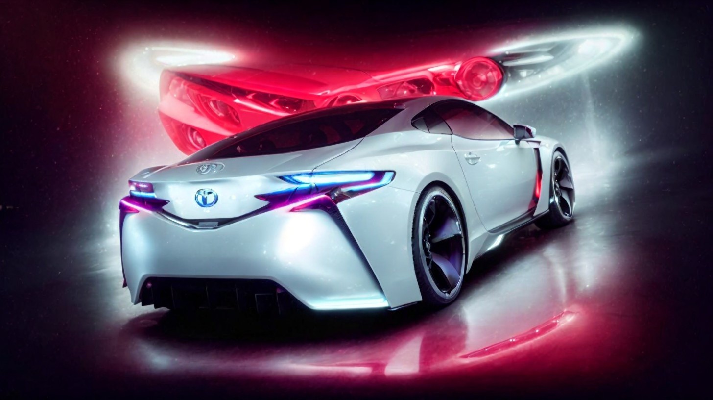 The image showcases a sleek, white Toyota car with a modern design, highlighted by vibrant pink and purple light trails in the background, creating a dynamic and futuristic atmosphere.