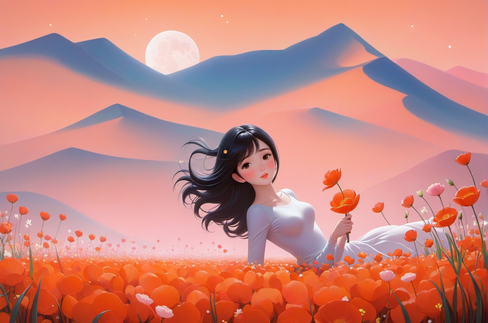 A cartoon in a spring landscape. Woman with flowers. Moon dew.