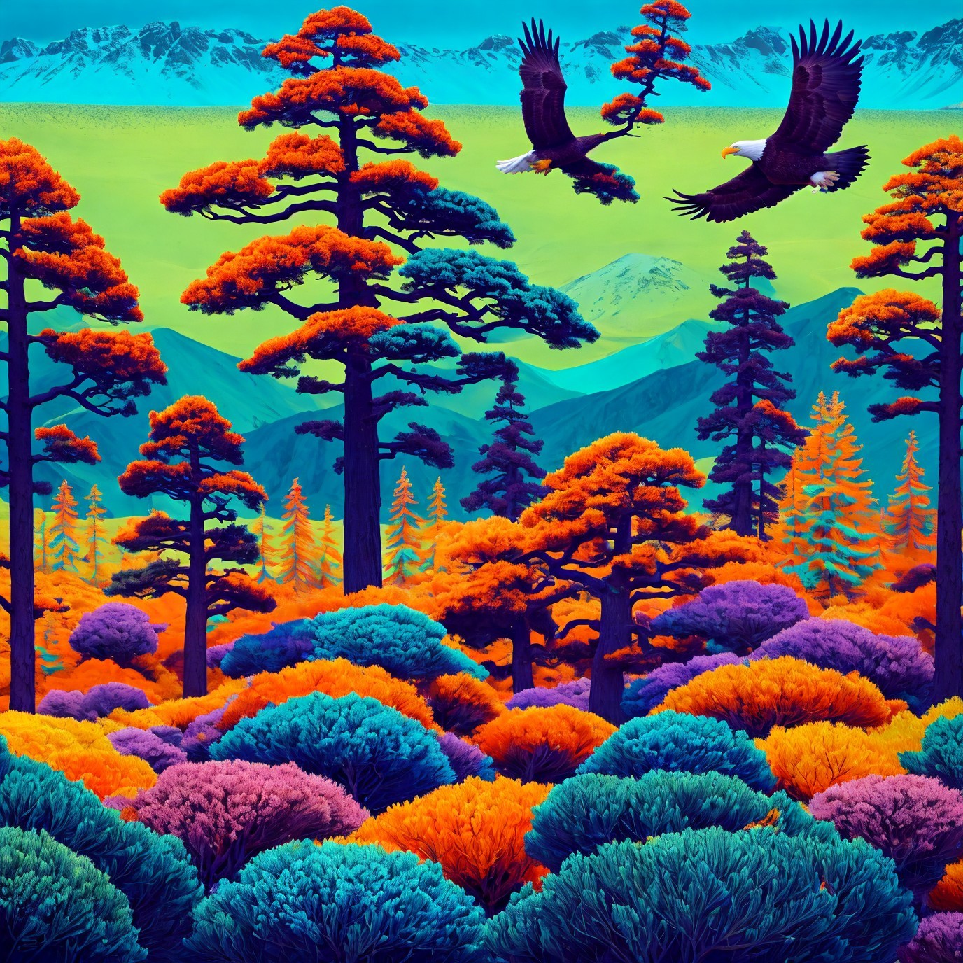 Vibrant, colorful forest with eagles soaring above, amidst a backdrop of picturesque mountains and a blue sky.