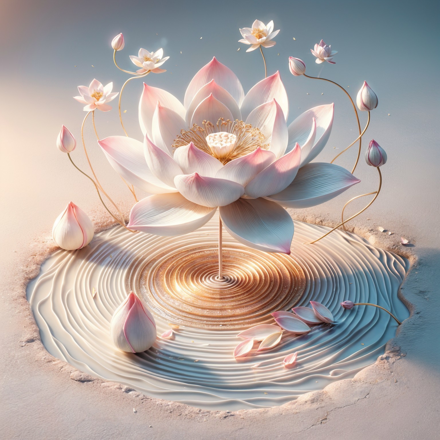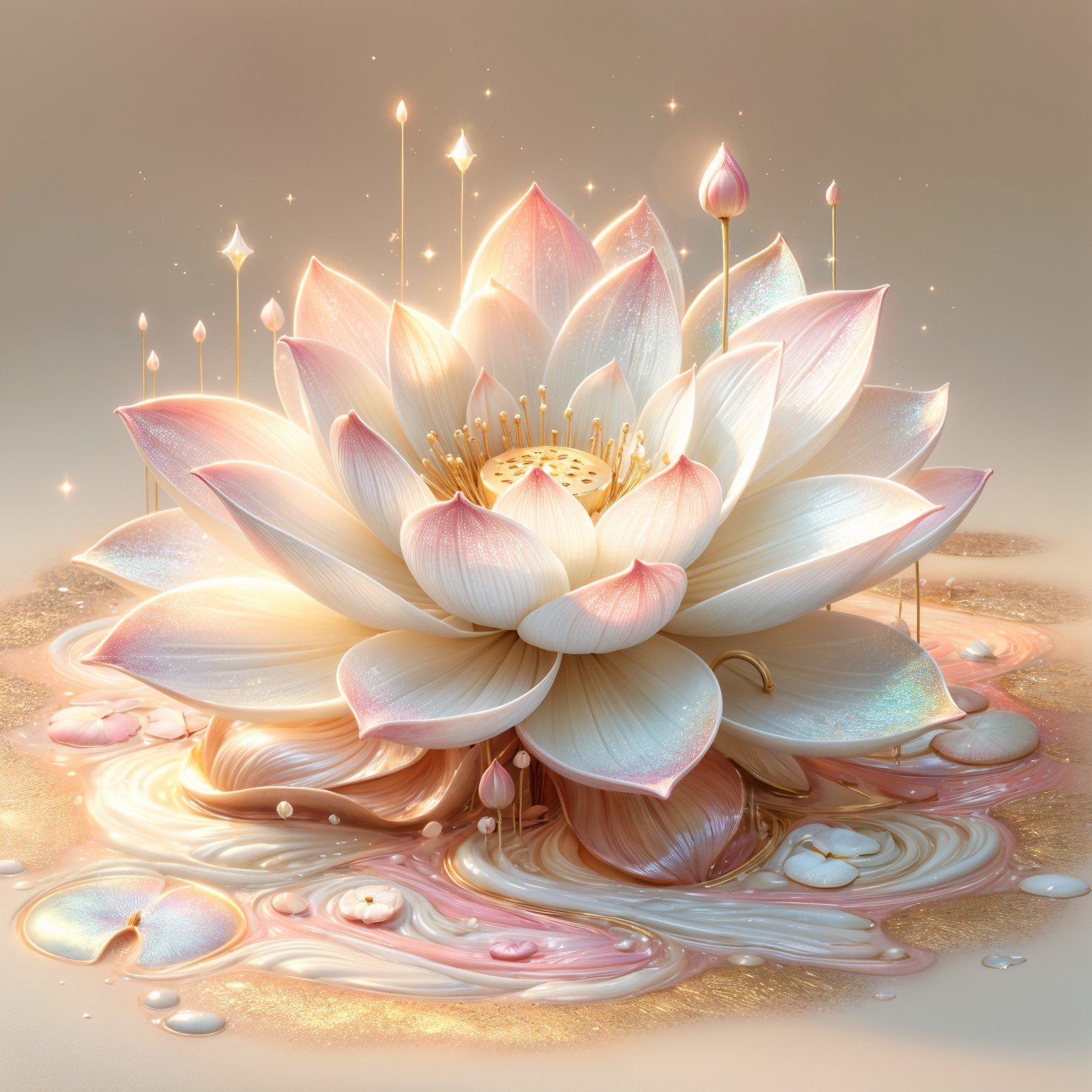 A serene landscape features a majestic lotus flower in soft pink and white hues, surrounded by smaller blossoms and reflective water. The scene exudes tranquility and elegance with golden accents.
