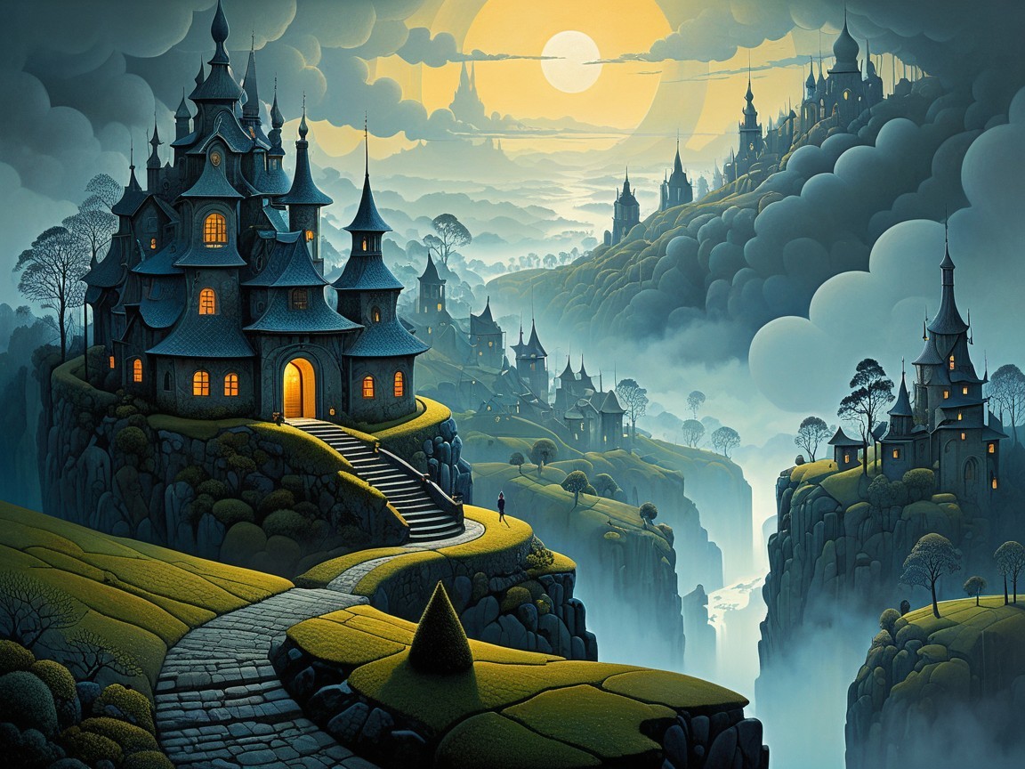Surreal landscape featuring towering castles on rocky hills. The moon casts a silvery glow over mist-covered valleys.