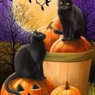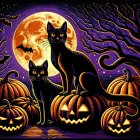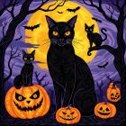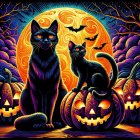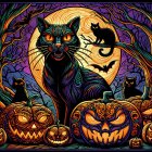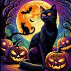A black cat with glowing orange eyes sits in a spooky landscape, surrounded by intricately carved pumpkins and a full moon. Bats fly overhead, enhancing the Halloween atmosphere.