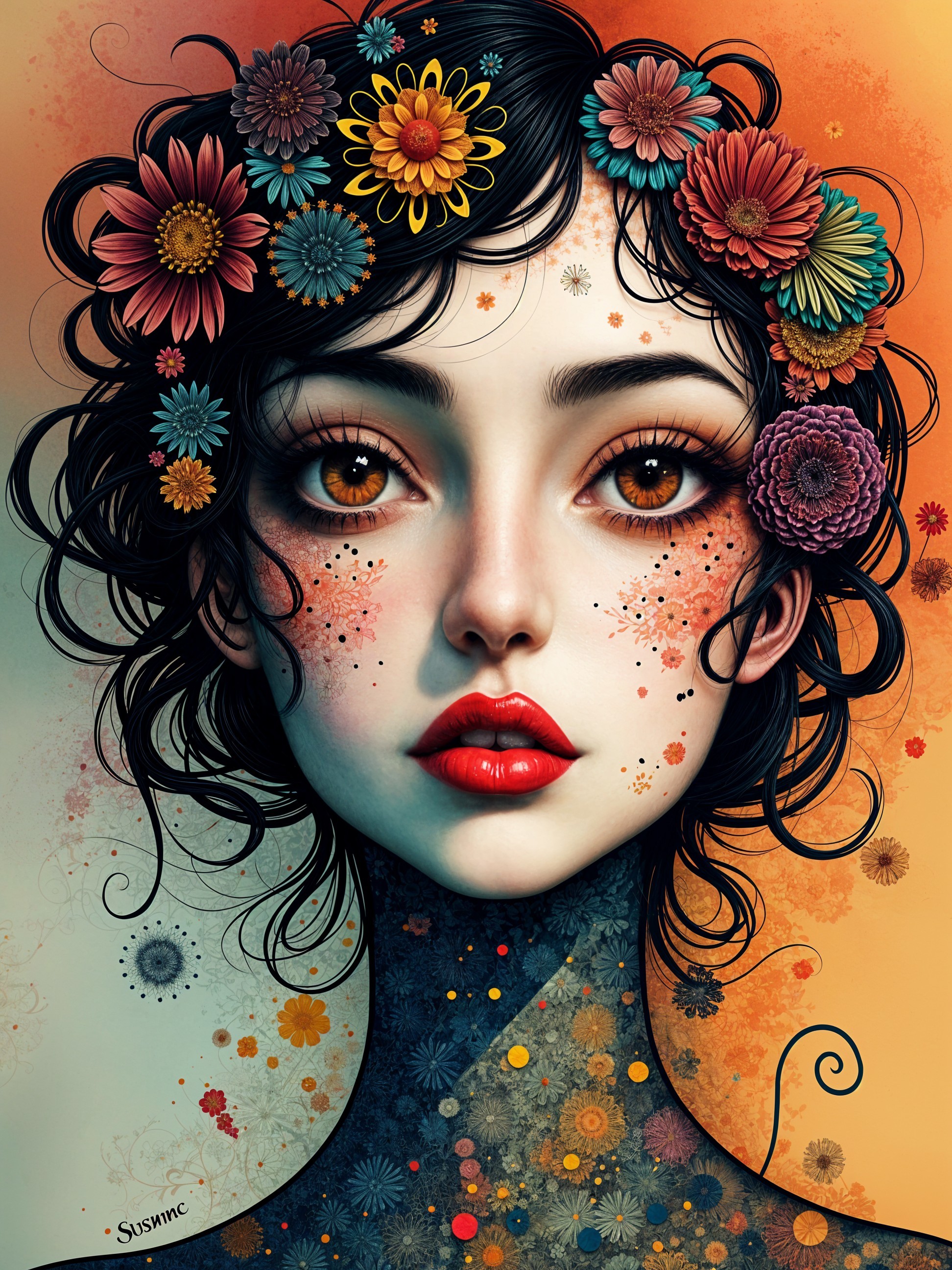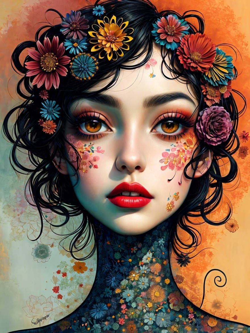 A dreamy portrait of a woman with curly hair adorned with vibrant flowers. Her expressive eyes and floral face paint create a mesmerizing, ethereal beauty against a colorful backdrop.