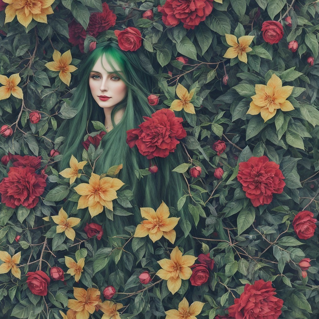 Poetess wandering among lianas of flowers