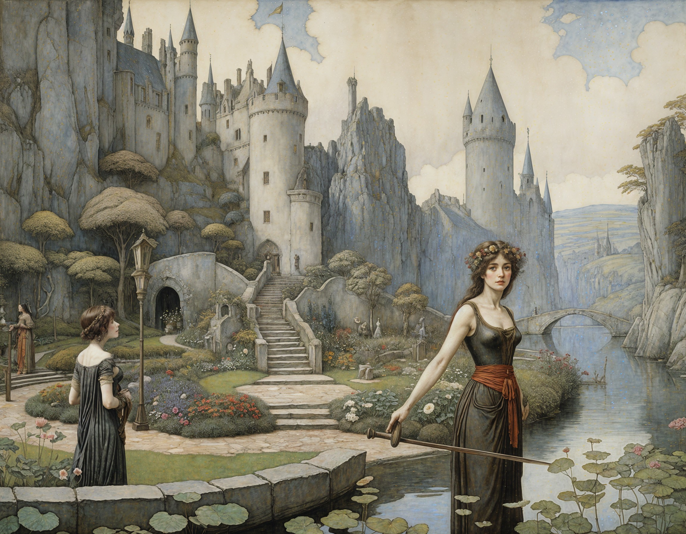 all sides sides view shots of a beautiful abrasive of the (cosmic magical mystical medieval garden:1.3), by (Arthur Rackham and Edward Deakin, Michael Parkes:0.8), (Tempera and depiction:0.8), 16:9, (painting: Anton Mauve and Enki Bilal Edward Gorey, junji ito, klimnt , gold leaf color, silver leaf color