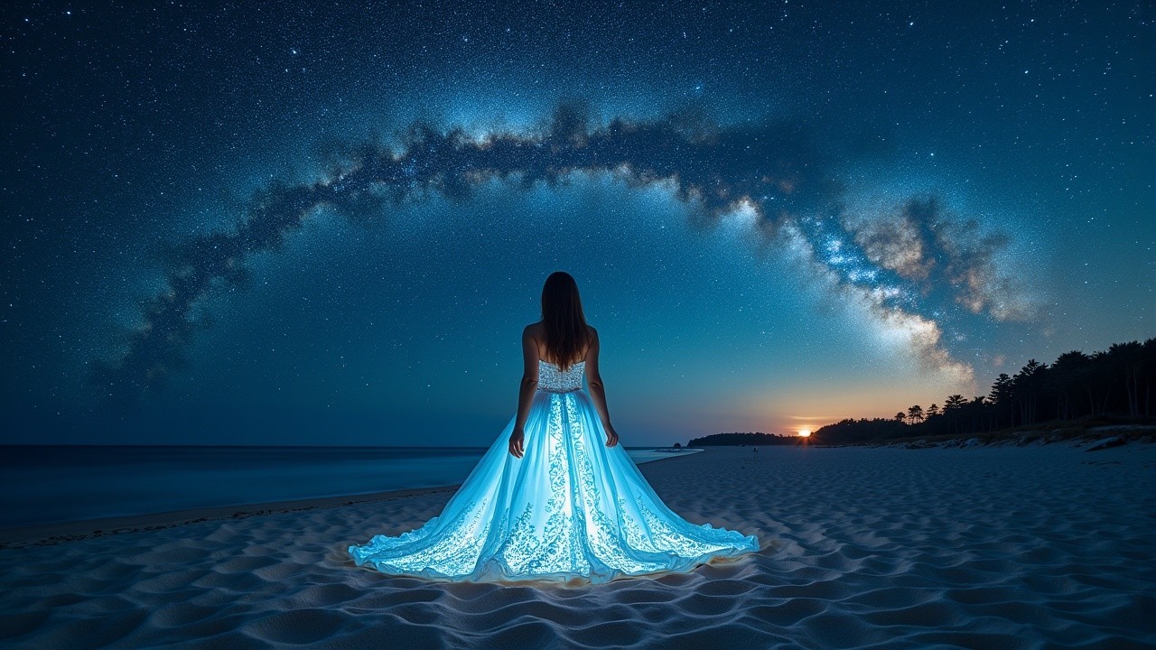 A figure in a stunning blue gown stands on a sandy beach under a starry sky, gazing at the Milky Way arching overhead. The horizon glows with the colors of sunrise.