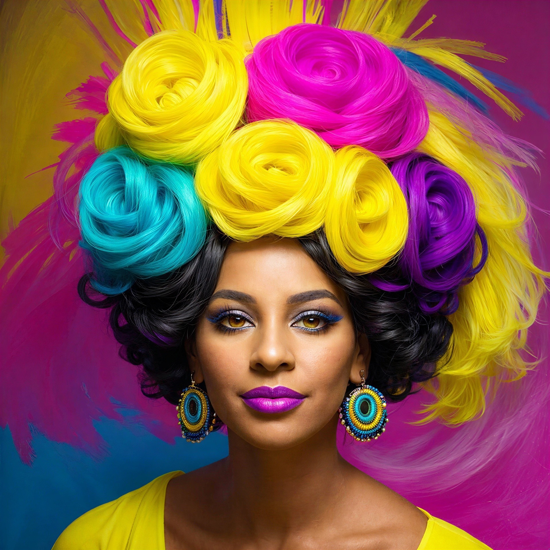 A young woman with a long oval face, tanned skin, and black curly hair that extends into bright yellow, magenta, teal, and purple rolled bun style pieces with a spiky texture to create a large playful afro, looks straight ahead. Her light brown eyes are enhanced with purple and blue eyeliner and
