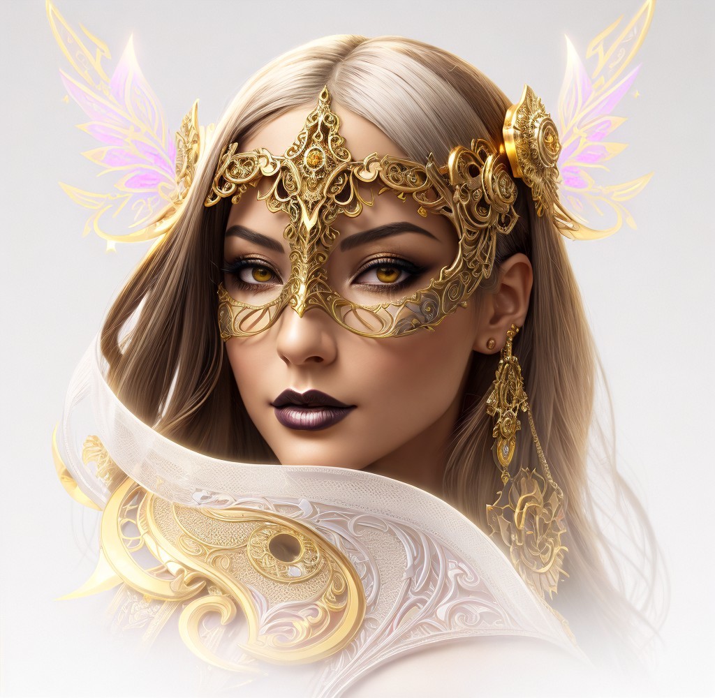 Fantasy portrait, beautiful female masked head, ornamental details, vibrant luminous pointism, high detailed lighting, extremely ornamental, golden ratio, gothic flourescent surrounding, maximalism, tints of steampunk, biomorphic shapes, silvery cuts, volumetric lighting, eldritch, triadic color scheme gold ochre silver, vector 9:4, beautiful female hyper-detailed illustration, translucent psychpomp, rim lighting, dark fantasy art