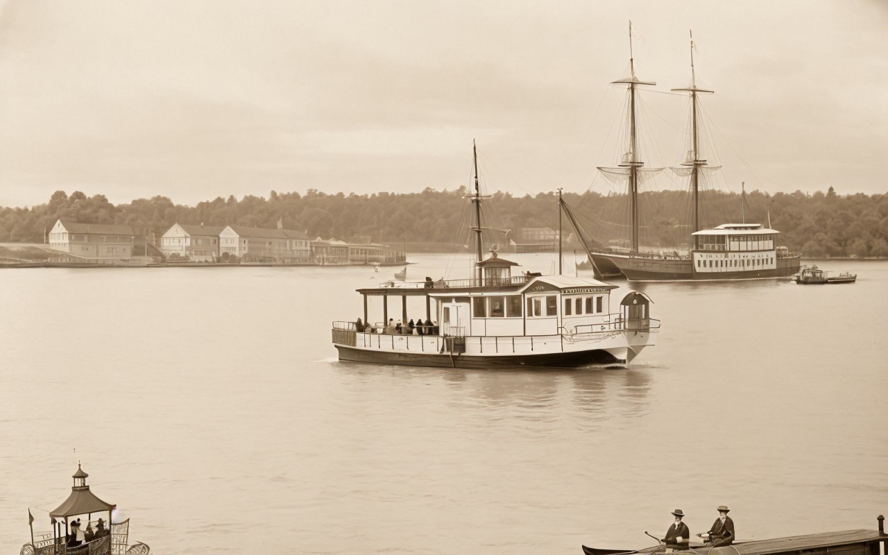 The image depicts a vintage steamboat navigating a calm river, with a larger sailing ship in the background. Soft sepia tones give it a nostalgic, historical atmosphere.