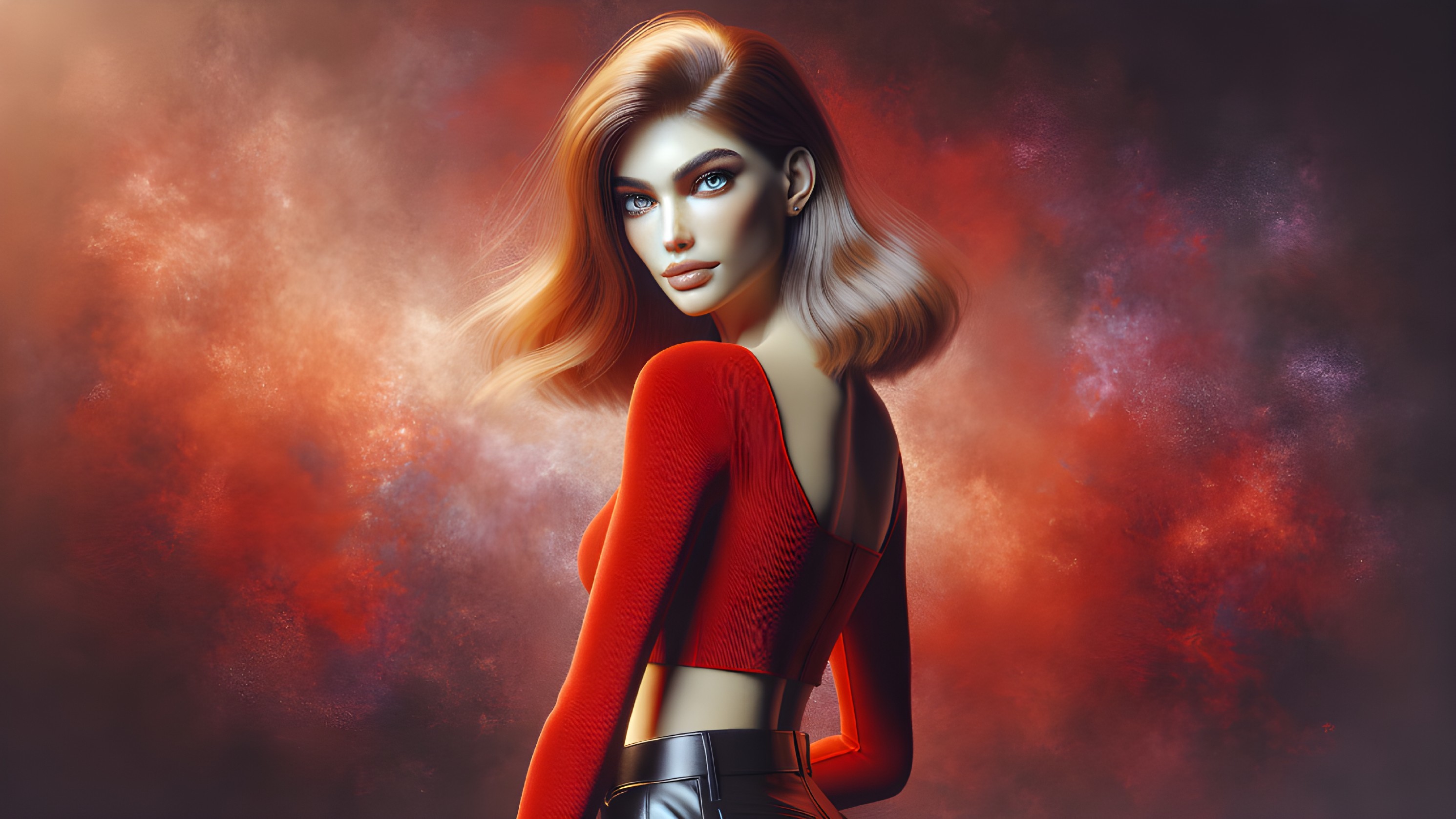 A stylized digital illustration of a woman with blonde hair and blue eyes, wearing a red outfit, against a smoky backdrop.