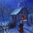 A serene winter scene features a cozy log cabin with smoke rising from the chimney, under a full moon. A figure walks along a snowy path, carrying a basket, surrounded by bare trees.