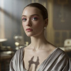 A serene portrait of a young woman with flowing blonde hair, adorned with flowers. She sits elegantly in a plush chair, bathed in soft light, exuding grace and beauty.